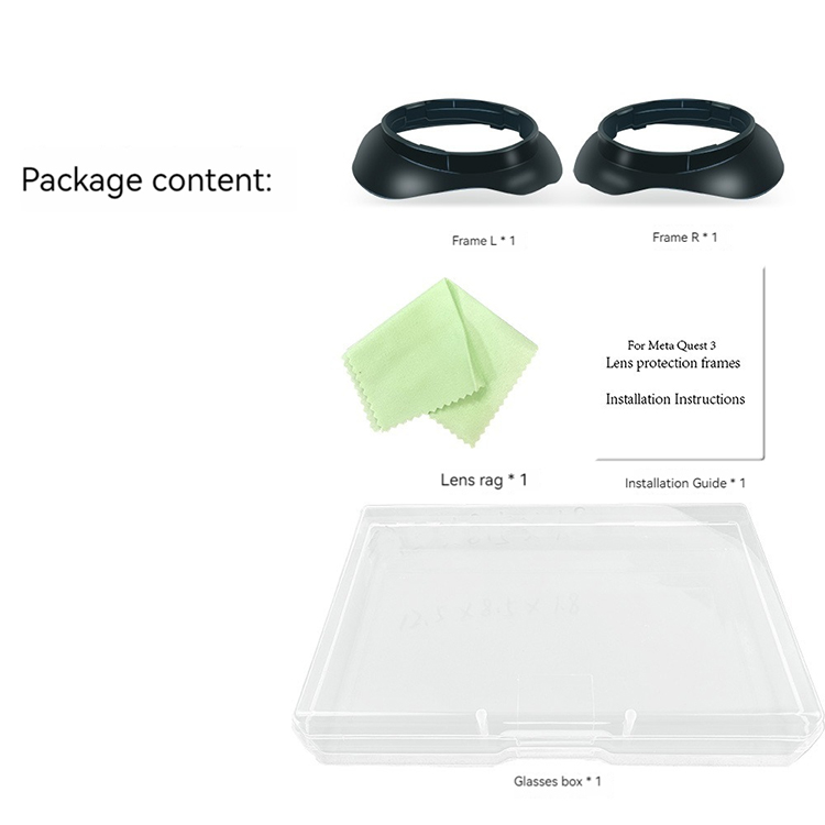 2x Lens Protection Frames (L&R) + 1x Lens Cloth + 1x Eyeglass Case + 1x Instruction Manuals