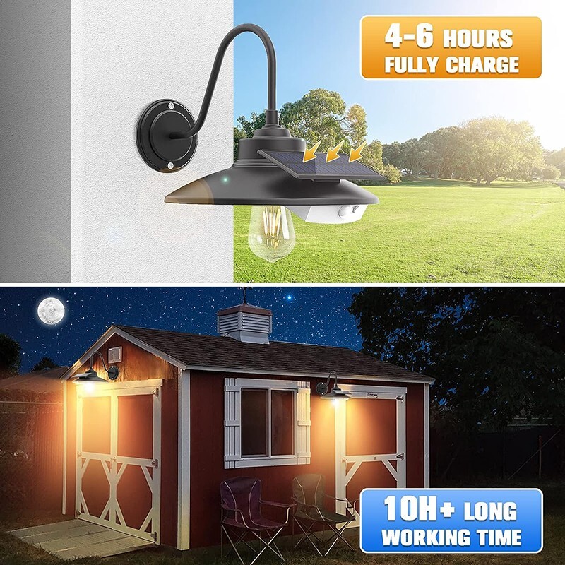 Retro Look Solar Barn Lights: The matte black finish combined with the elegant arm and classic curved top. Classic solar barn light exterior design to reveal more of the bulb and provide 3000k warm white lingting effct. Attractive retro look Solar Barn Lights is perfect for decorating your yard, barn, shed, garden, porch, garage, chicken coop,ect.