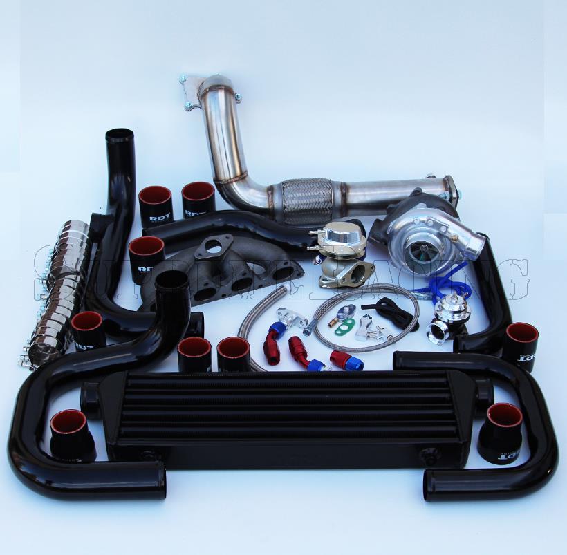 1x D series bottom mount Turbo manifold. 1x T3/T4 .57 AR Jurnal Bearing TurboCharger. 1x Bold-on Intercooler piping kit. 1x Intercooler. 1x Bolt-on Downpipe (AC & PS compatible). 1x Blow off valve. 1x Boost gauge. 1x Oil feed line with Restrictor. 1x Oil Return line. 1x 35/38 mm wastegate. 1x Manuel Boost Controller.