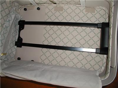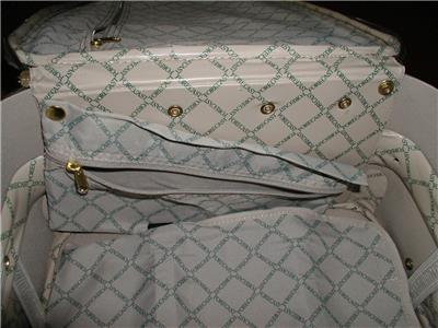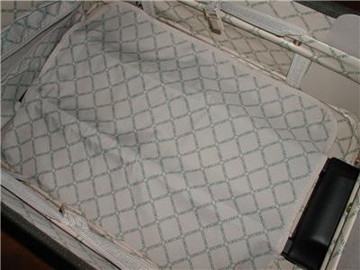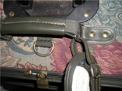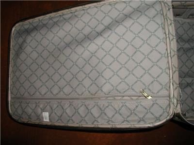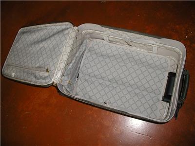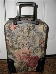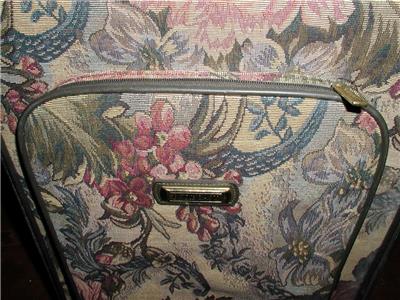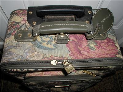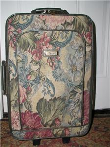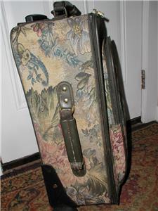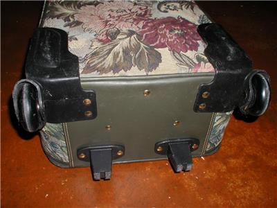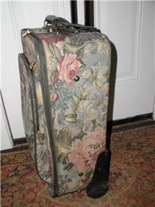 Nice vintage 1990's rolling medium size suitcase with faux leather accents. In good used condition as shown. Is missing it's zipper pulls but those can be easily replaced. Also one of the snaps on the inside removable small bag has come off.