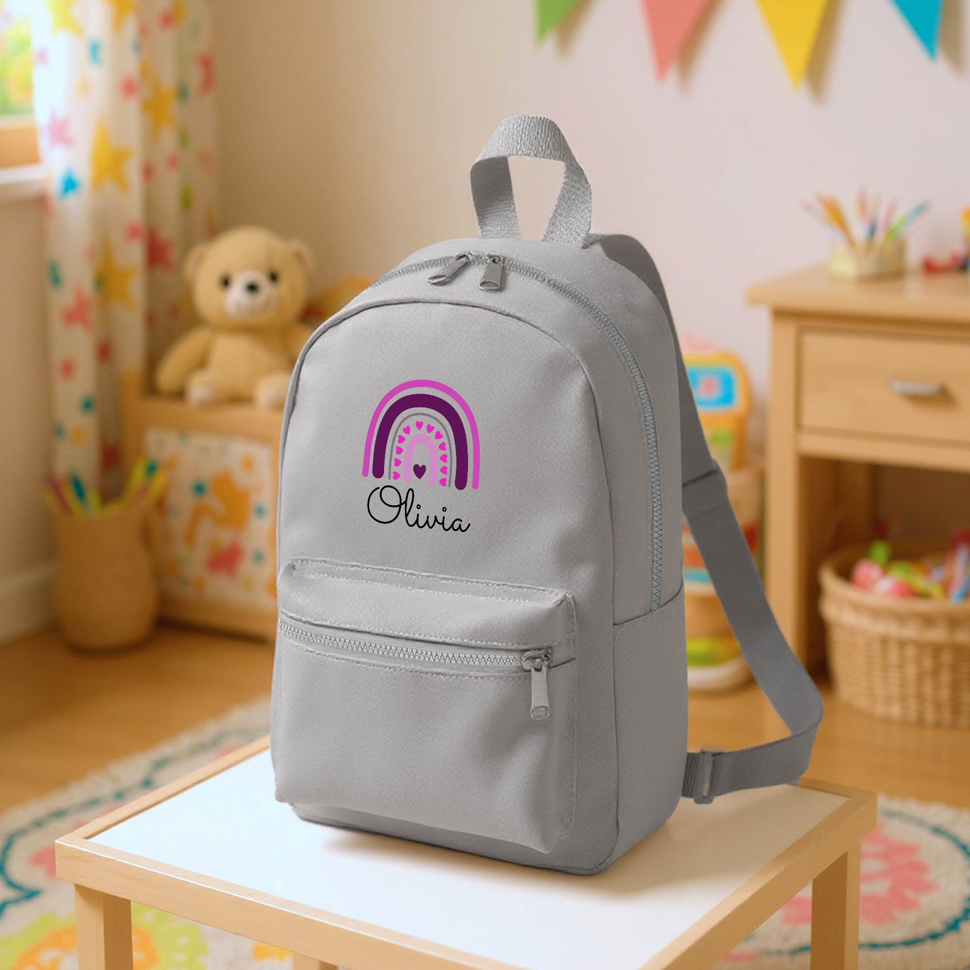 This Personalised Girls Mini Backpack showcases a custom signature name with a fun purple and pink rainbow design—perfect for girls heading back to school, nursery or college. It’s a mini essential that suits infants, juniors and primary school kids.