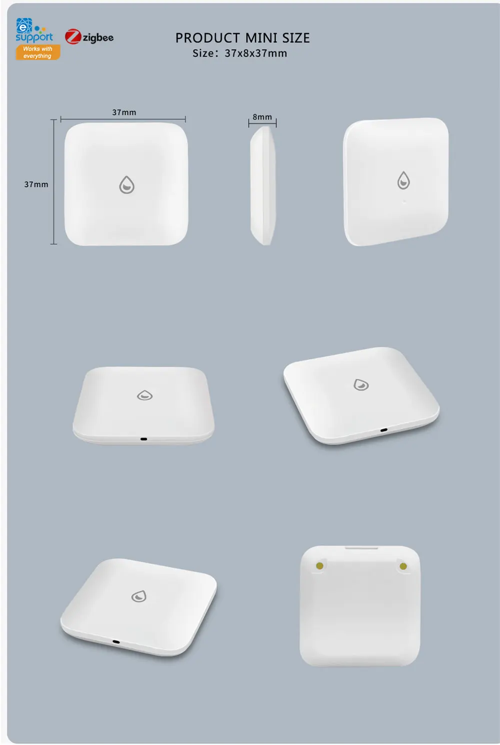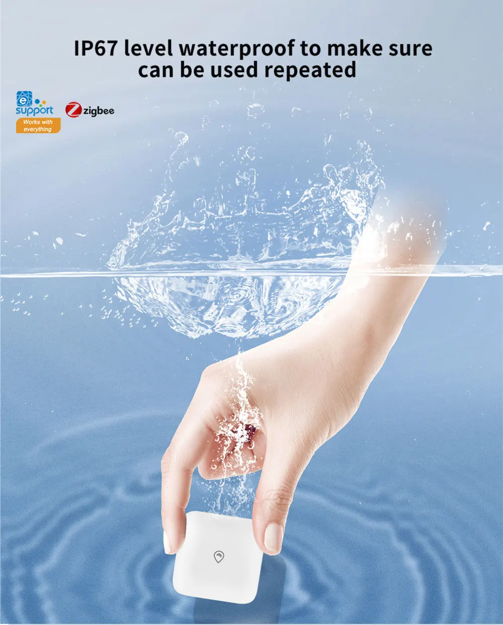 A water immersion sensor that can detect water leakage in the environment in real-time. When water immersion is detected, the detector will send an alarm signal to the host and report information to the user's mobile phone. When the water level at the detection point reaches 0.5mm, the water intrusion sensor will report the water situation.