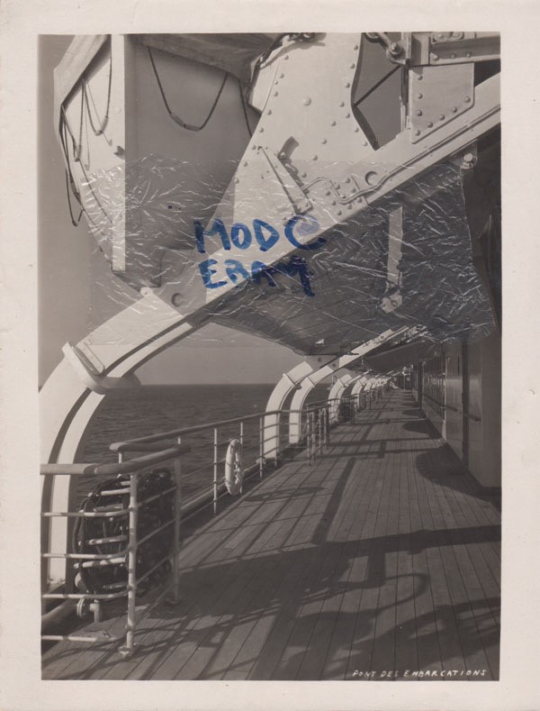 B/W single weight glossy photo of the boat deck showing a lifeboat on the Champlain. This was inadvertently stamped as the Normandie. It seems that someone in the press department was not paying attention.