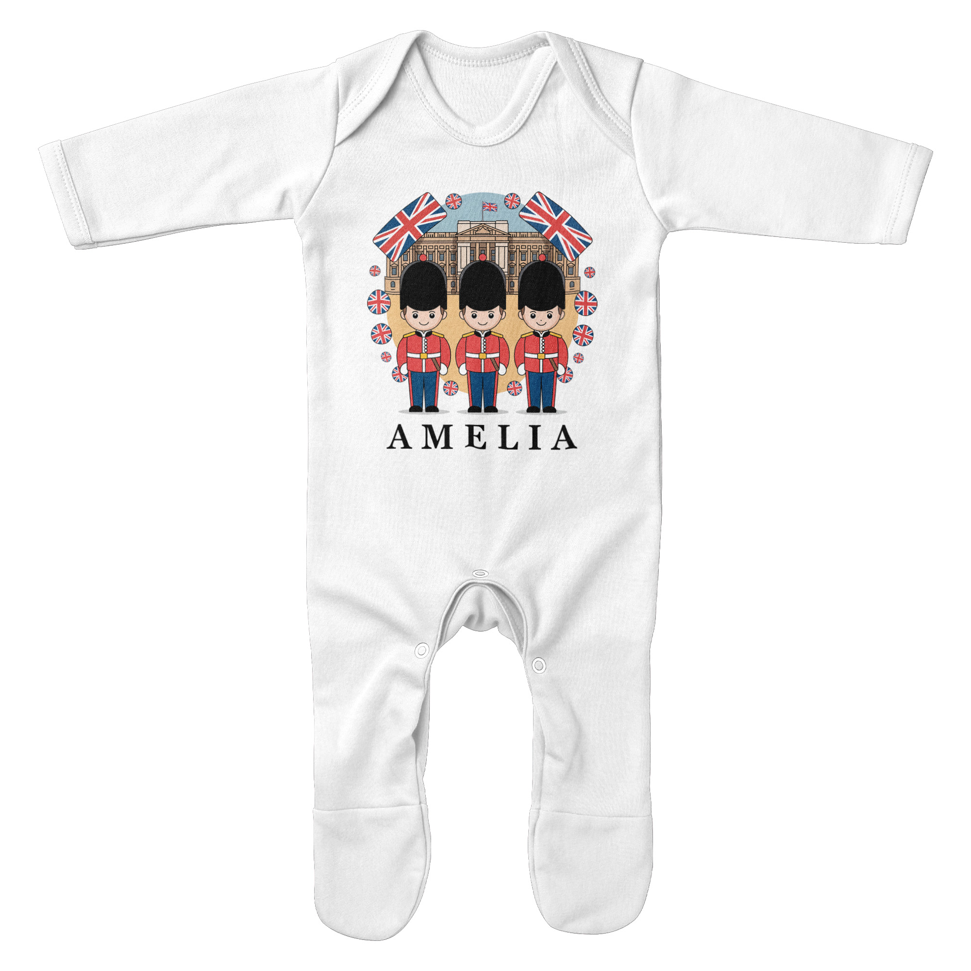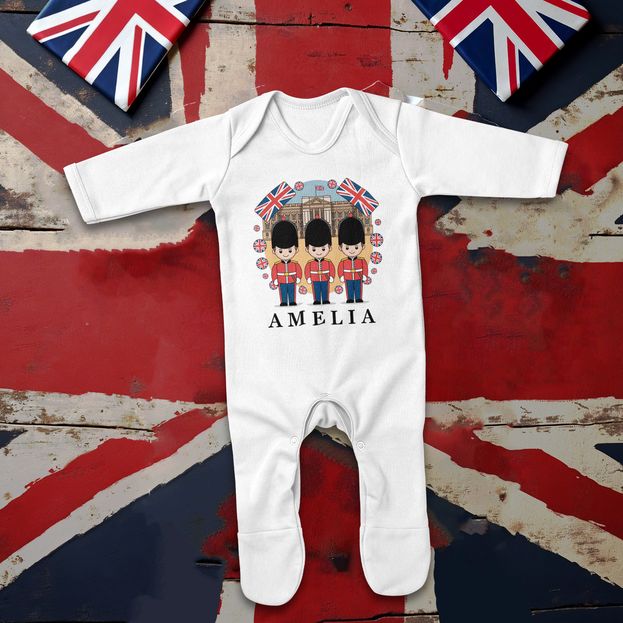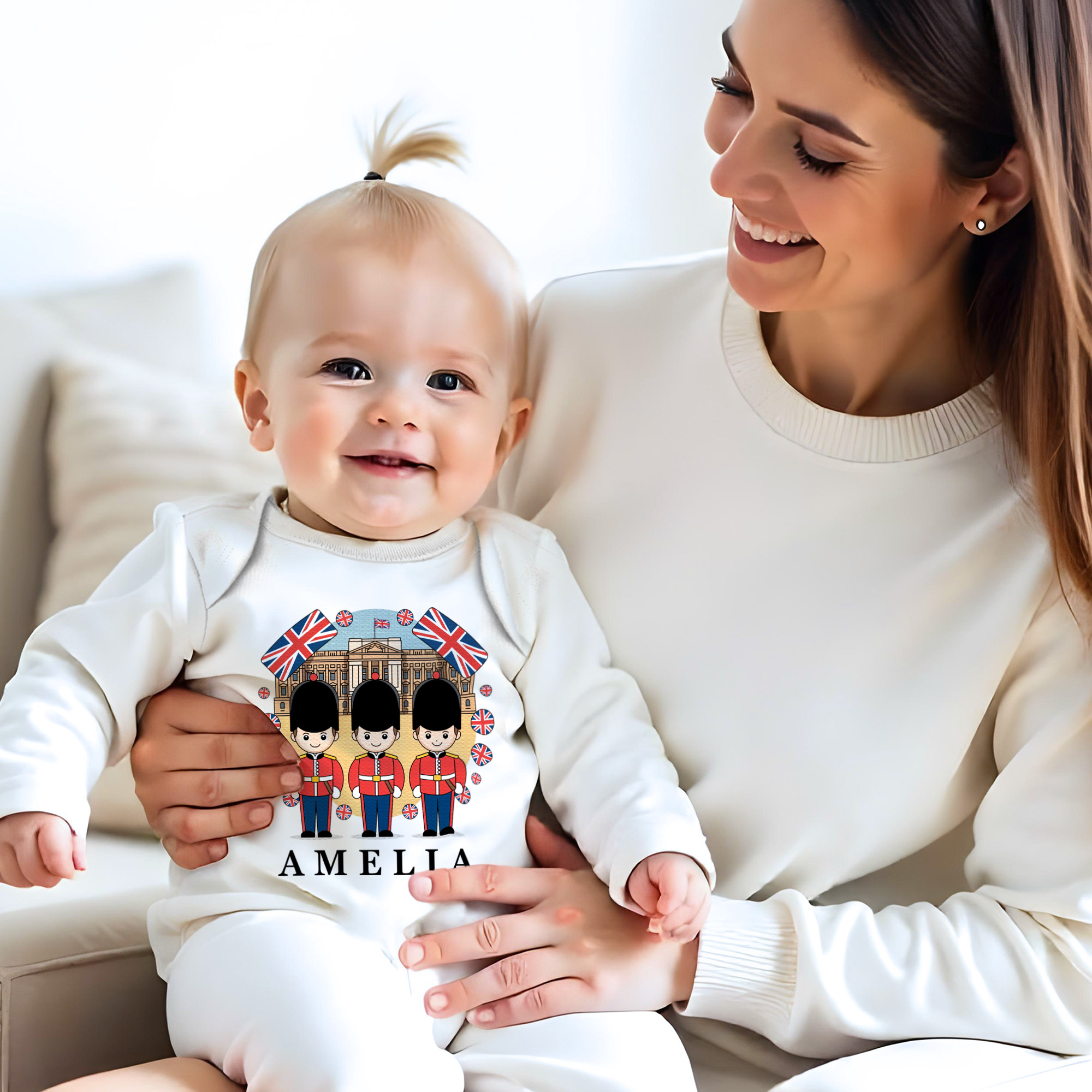 Personalised London Soldiers Baby Romper Suit with London Palace and Union Jack design with Custom Name perfect for boys and girls