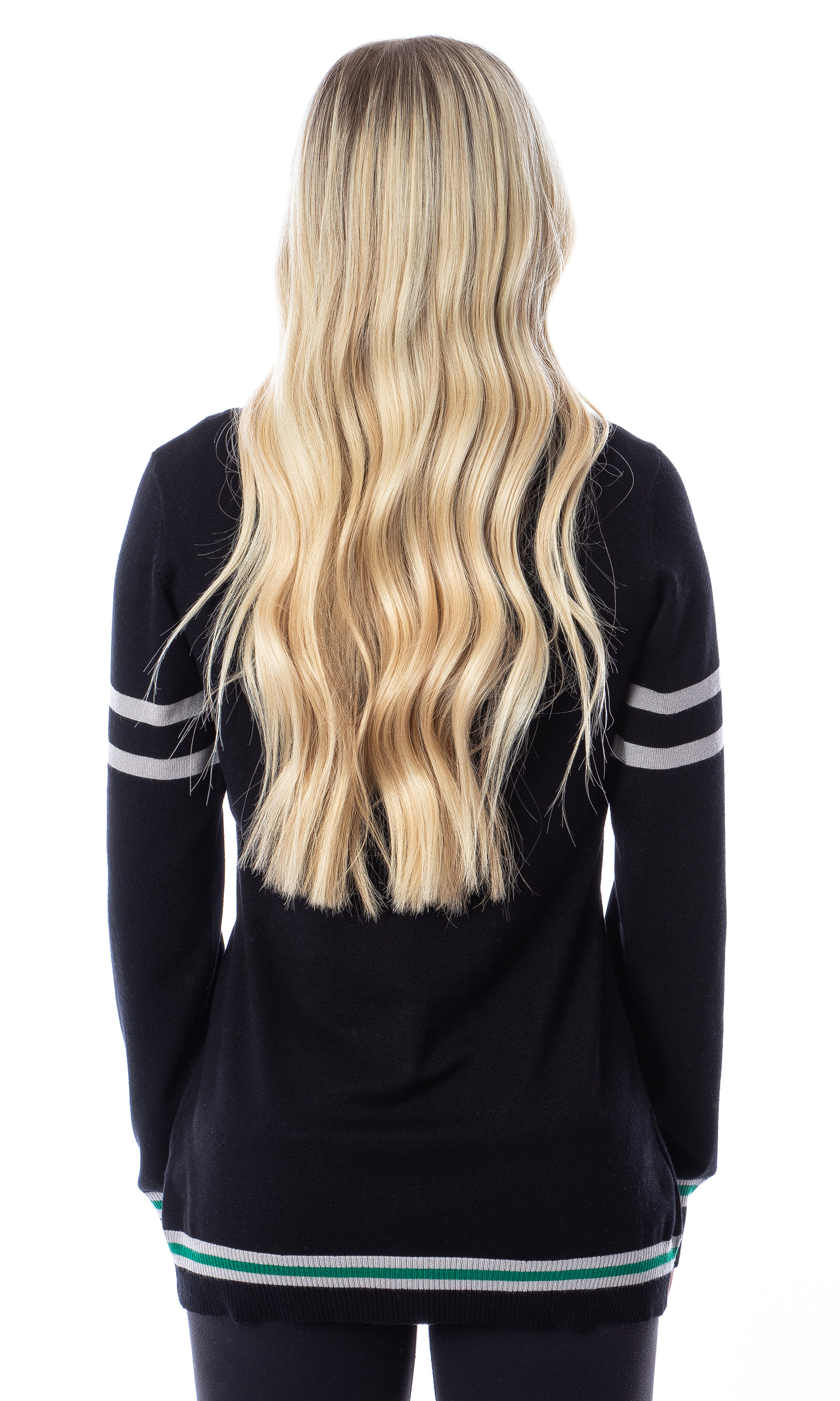 Show off your support for the slickest house in all of Hogwarts with this cozy button-down cardigan featuring the Slytherin crest! The relaxed, retro varsity style will have you feeling just like you're a student receiving lessons from Professor Severus Snape. The front of the cardigan features a great embroidered Slytherin house crest logo. The sleeves have a double grey stripe design, and the sleeve cuffs and bottom hem have a green and grey stripe pattern to match the Slytherin house colors. It is made of a soft 71% rayon / 29% polyester fabric blend.
