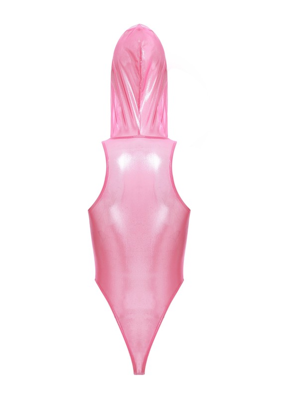 Hooded, sleeveless, briefs bottom, see through short jumpsuit for women, with front zipper closure.