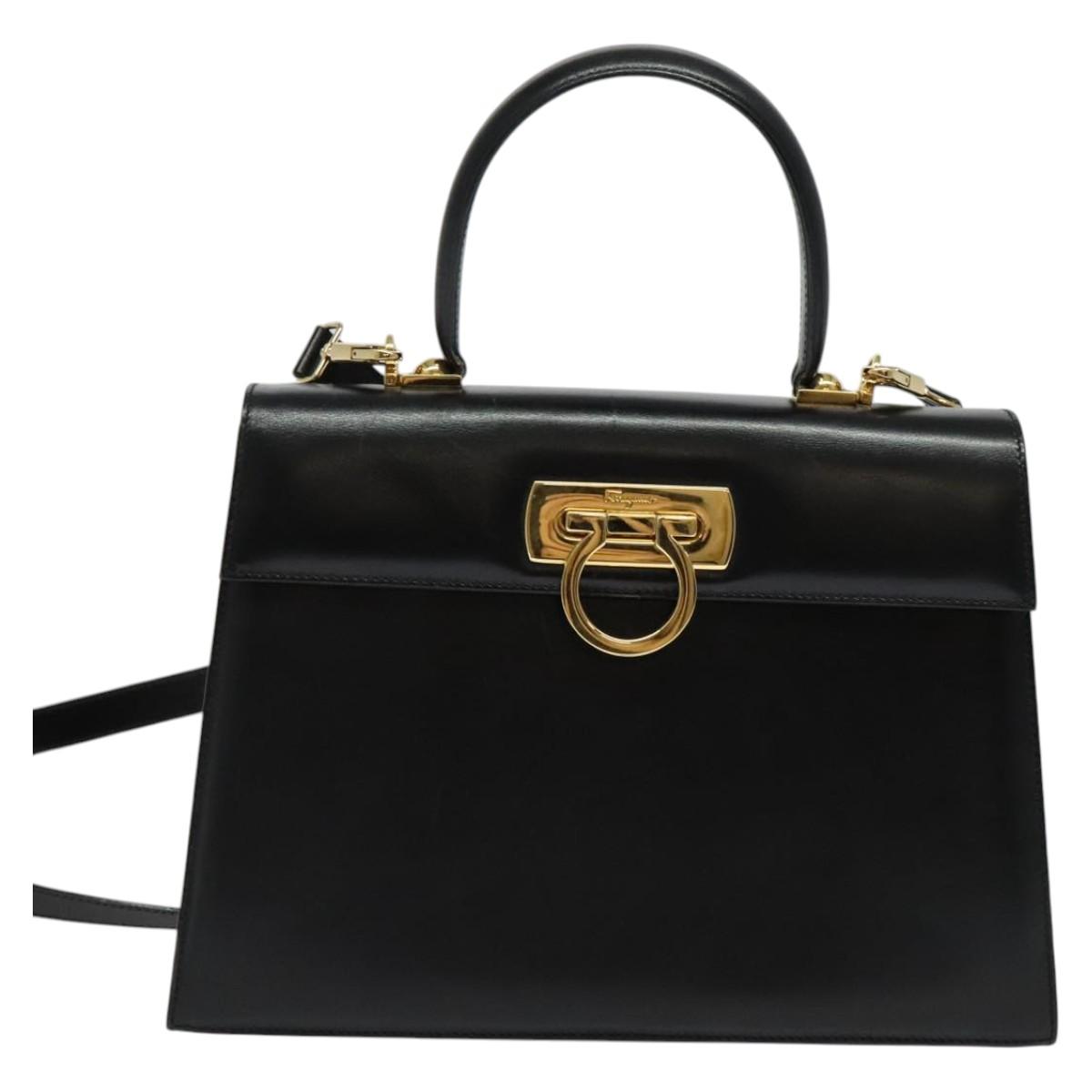 Salvatore Ferragamo Gancini Hand Bag Leather 2way Black Gold Auth 142244