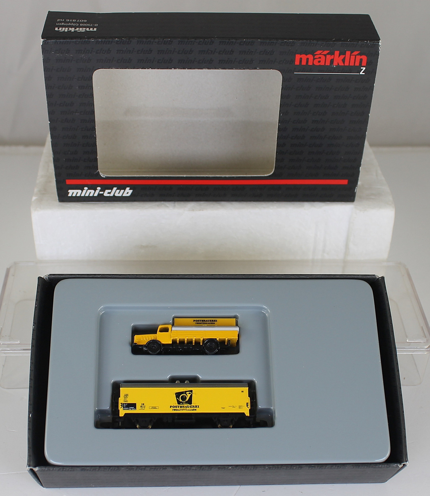 Vorbild: Das Set besteht aus 1 zweiachsigen Kühlwagen in gelb mit der Aufschrift "Postbrauerei Frontenhausen", Privatwagen eingestellt bei der Deutschen Bundesbahn (DB). 1 Oldtimer-LKW in gelb. Sonderserie vom Postmuseum