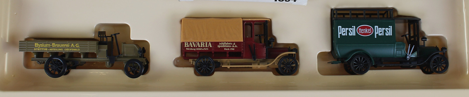 Das Set besteht aus 3 historische Modelle um 1915. Ein Büssing-Pritschenwagen der Elysium Brauerei Stettin (Länge 6,2 cm). Ein SAG-Pritschenwagen der Bavaria Spedition Nürnberg/Fürth (Länge 5,8 cm). Ein SAG-Paketpostwagen mit Werbeaufschrift „Persil“ (Länge 6 cm).