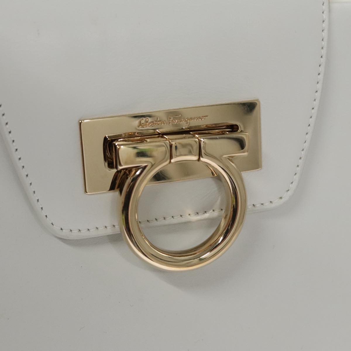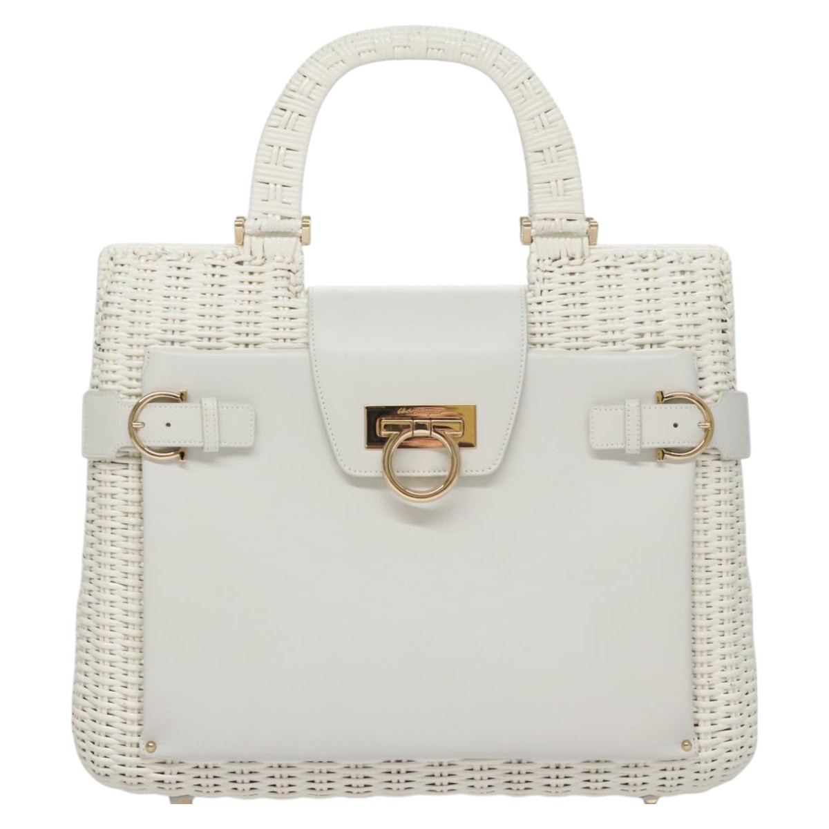 Salvatore Ferragamo Gancini Hand Bag Wicker White Auth 111468