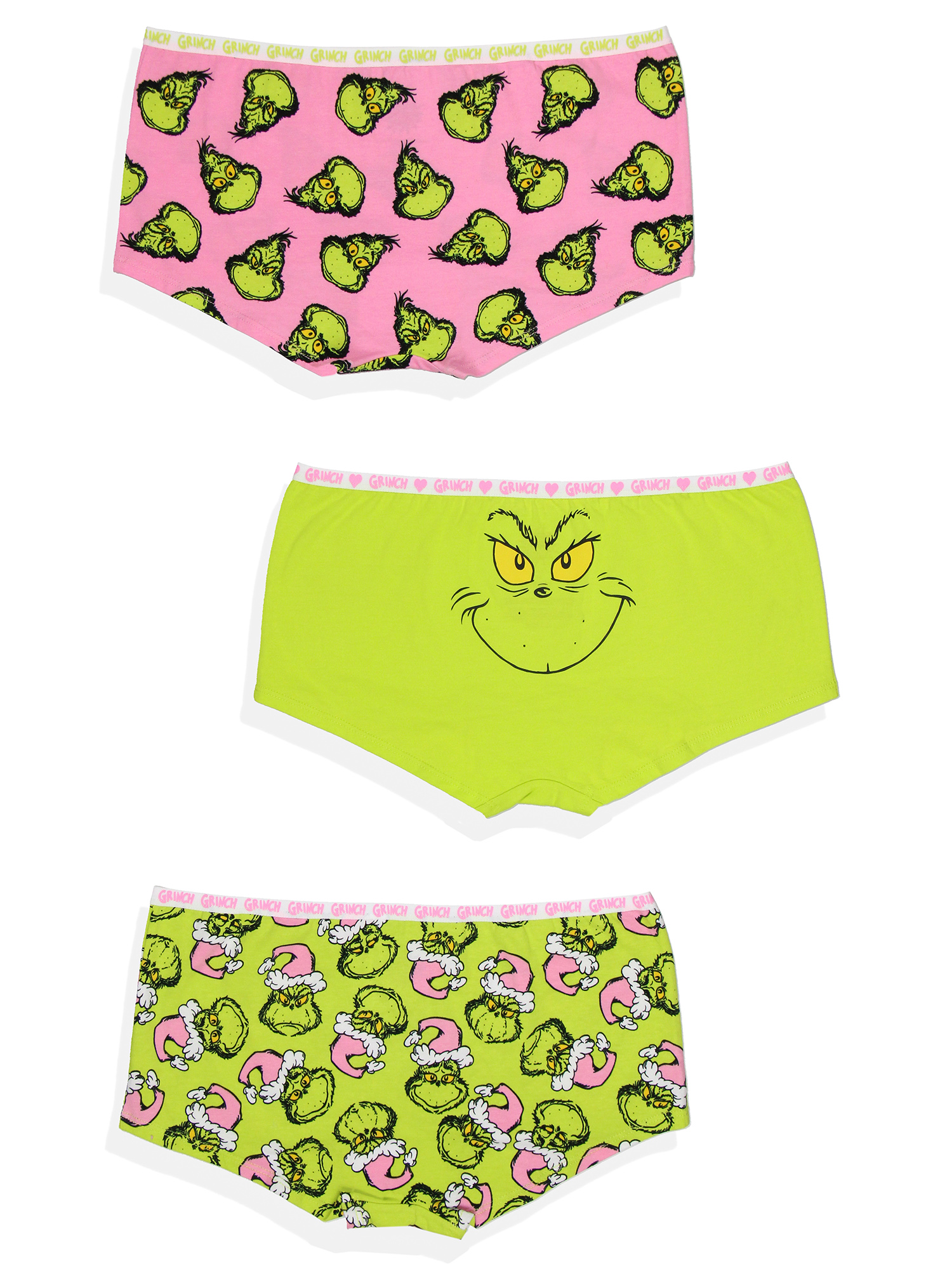 Add a mischievous twist to your holiday wardrobe with this 3-pack of Dr. Seuss The Grinch boyshorts! These fun, festive women’s underwear feature three distinctive designs that capture the playful spirit of The Grinch. One pair comes in a lively green hue, adorned with an allover print of The Grinch wearing a cheeky pink Santa hat. Another pair is green, featuring a bold Grinch face on the back, great for adding a little extra sass to your look. The final pair is in a festive pink color with an all-over print of The Grinch’s face for a pop of color and holiday mischief. These soft, comfortable boyshorts bring just the right amount of stretch and holiday cheer to keep you comfy all season long!