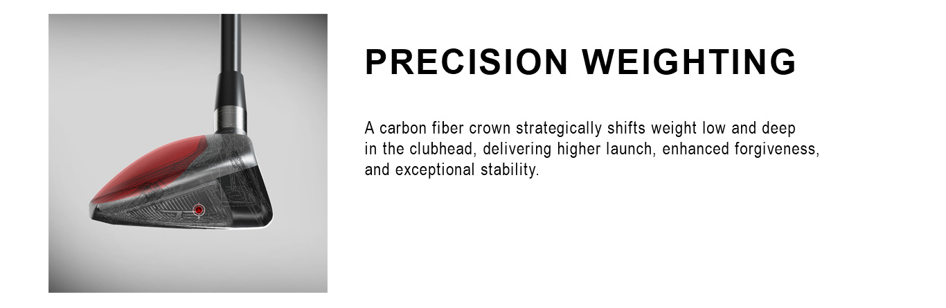 A carbon fiber crown strategically shifts weight low and deep in the clubhead, delivering higher launch, enhanced forgiveness, and exceptional stability.