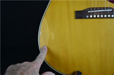 This guitar came directly from Epiphone to my supplier, it was never sold retail, the protective cover is still on the pickguard. It was sent to my supplier because of a finish blemish on the top of the lower bout. I have included a close-up picture pointing to it. The guitar was examined by certified technicians and no other issues were found. When we polished the guitar we did not find any other blemishes, dings or cracks.