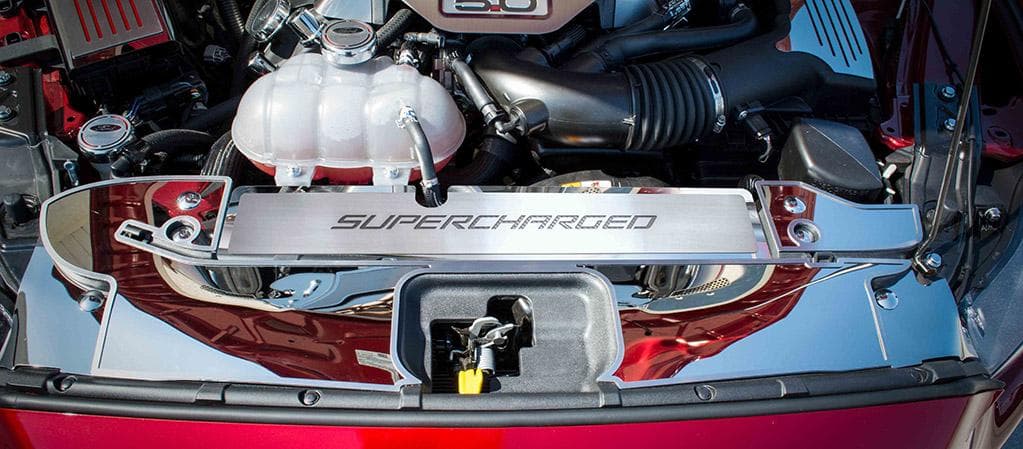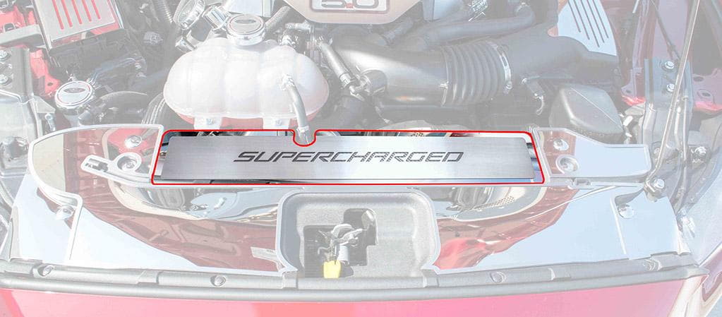 Designed to fit your Mustang GT perfectly, this radiator cover is constructed from high-quality stainless steel polished for a brilliant mirror shine and feature a Bulliet Green vinyl "SUPERCHARGED" Inlay. All of our American Car Craft parts are hand-crafted in the USA