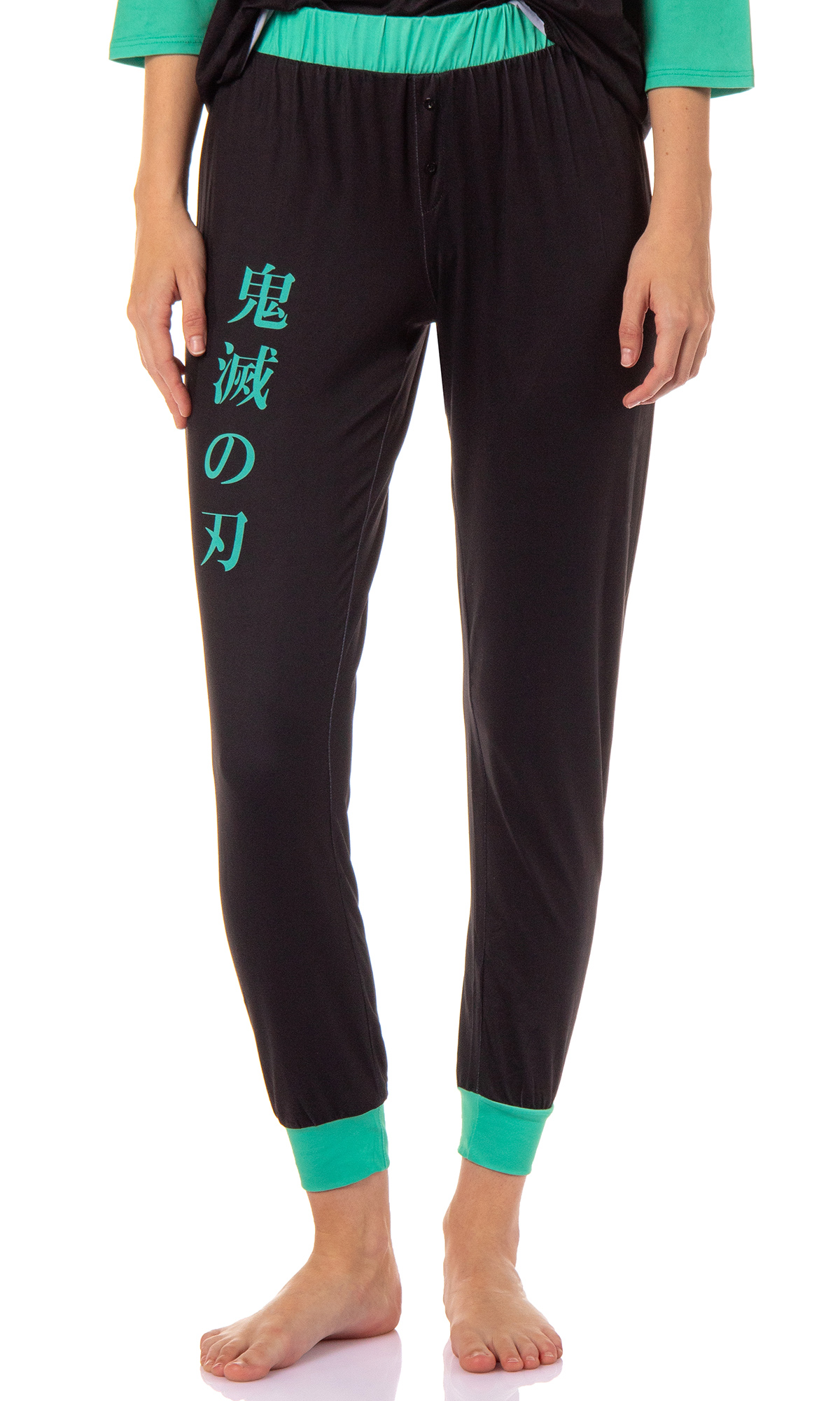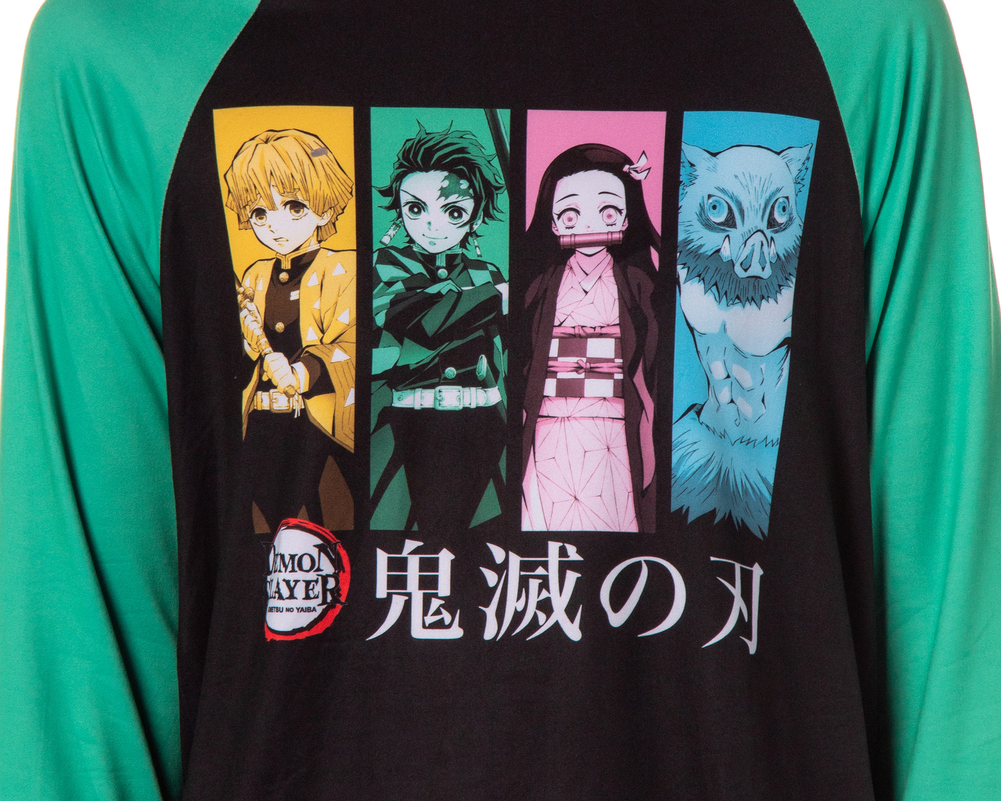 Unleash the power of your favorite Demon Slayer with these Pajamas. This Demon Slayer Sleep set features a black top with a character panel and Kanji design on the front with raglan green sleeves. The black pants feature a kanji print design on the right leg with contrasting green waistband and bottom cuffs. Made from great, breathable fabric, this pajama set ensures a restful night's sleep, all while showcasing your devotion to the world of demons and warriors. Whether you're lounging at home or settling in for a night of adventure in your dreams, our Demon Slayer women's pajama sleep set will keep you both snug and stylish, making every night an opportunity to relish the spirit of Tanjiro, Nezuko, and the whole Demon Slayer universe.