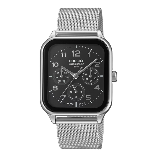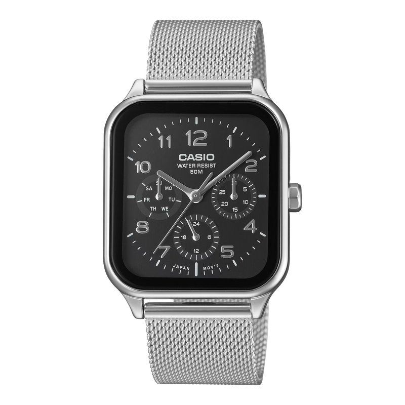 Hard to find and newly released, the MTP-M306-1AV stands out with its black dial, mesh bracelet, and bold 24-hour sub-dial. A clean, modern evolution of Casio’s multi-function analog design. Basic Information Case size (L× W× H) 44.5 × 34 × 9.4 mm Weight 81 g Case and bezel material Stainless steel Band Stainless Steel Mesh Band Adjustable Clasp Water resistance 50-meter water resistance Power supply and battery life Approx. battery life: 2 years on SR621SW Exterior Glass Mineral Glass Compatible band size 150 to 205mm Watch Features Accuracy Accuracy: ±20 seconds per month Other features Regular timekeeping: Analog: 3 hands (hour, minute, second), 3 dials (date, day, 24-hour)