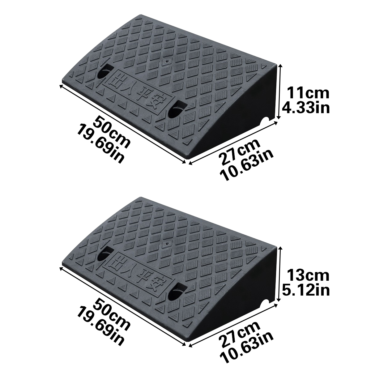 High Safety – The curb ramp reduces the risk of vehicle stalling and accidents at intersections, enhancing safety. The outdoor threshold ramp set can be permanently installed in high-traffic areas using the integrated mounting holes on the bottom of each ramp, eliminating the need for repeated removal and installation. The car ramp sections can be easily connected in seconds to create a perfectly sized curb ramp for your driveway.