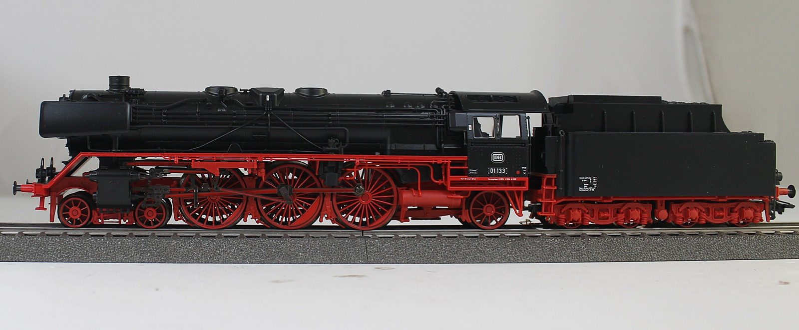 Vorbild: Dampflokomotive Baureihe 01 der Deutschen Bundesbahn (DB) in schwarz. Betriebszustand um 1958 mit Altbaukessel und Witte-Windleitblechen. Betriebsnummer 01 133.