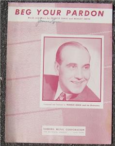 Beg Your Pardon Composed and Featured by Francis Craig and his Orchestra. Words and Music by Francis Craig and Beasley Smith. Sheet music is in good condition, wear at edges, previous owner's name on front cover. 1947 Robbins Music Corporation.