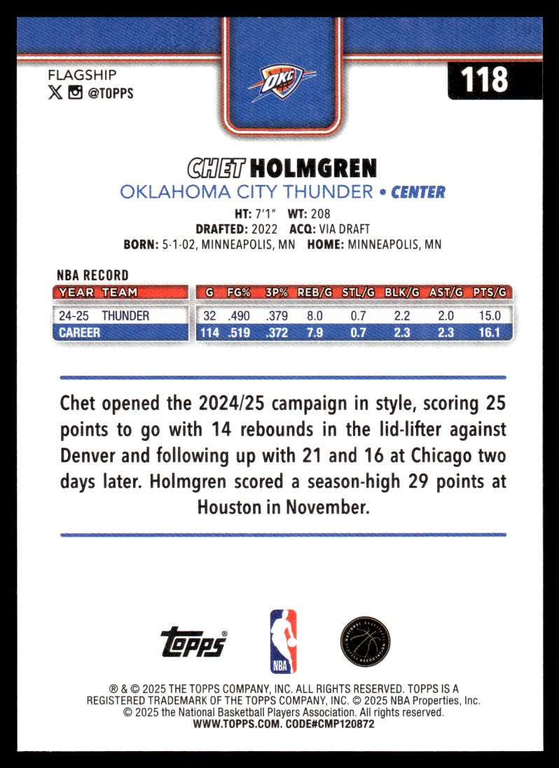 | 2025-26 Topps CHET HOLMGREN #118 Oklahoma City Thunder | ||||||||||||||||