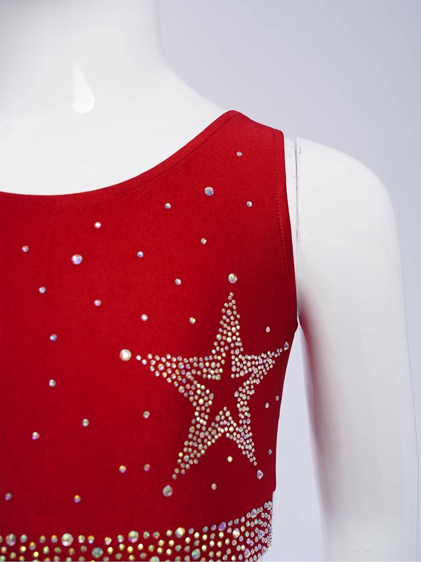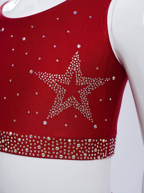 Girl’s 2-piece outfit with sparkling rhinestone stars is eye-catching enough to make your child the spotlight in any performance.