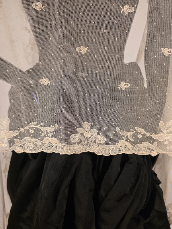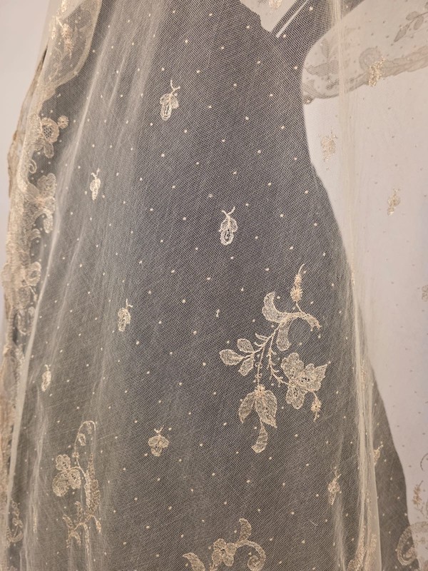 DESCRIPTION: FASHIONED OF A VERY FINE BRIDAL NET THAT IS RICHLY HAND EMBROIDERED IN SILK FLOSS IN SPRIGS THROUGHOUT THE GROUND WITH FLORAL PATTERNS RUNNING AROUND ALL THE EDGES. VERY LARGE DETAIL IS ON THE CENTER BOTTOM OF EACH SIDE.