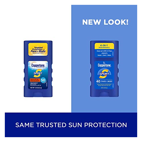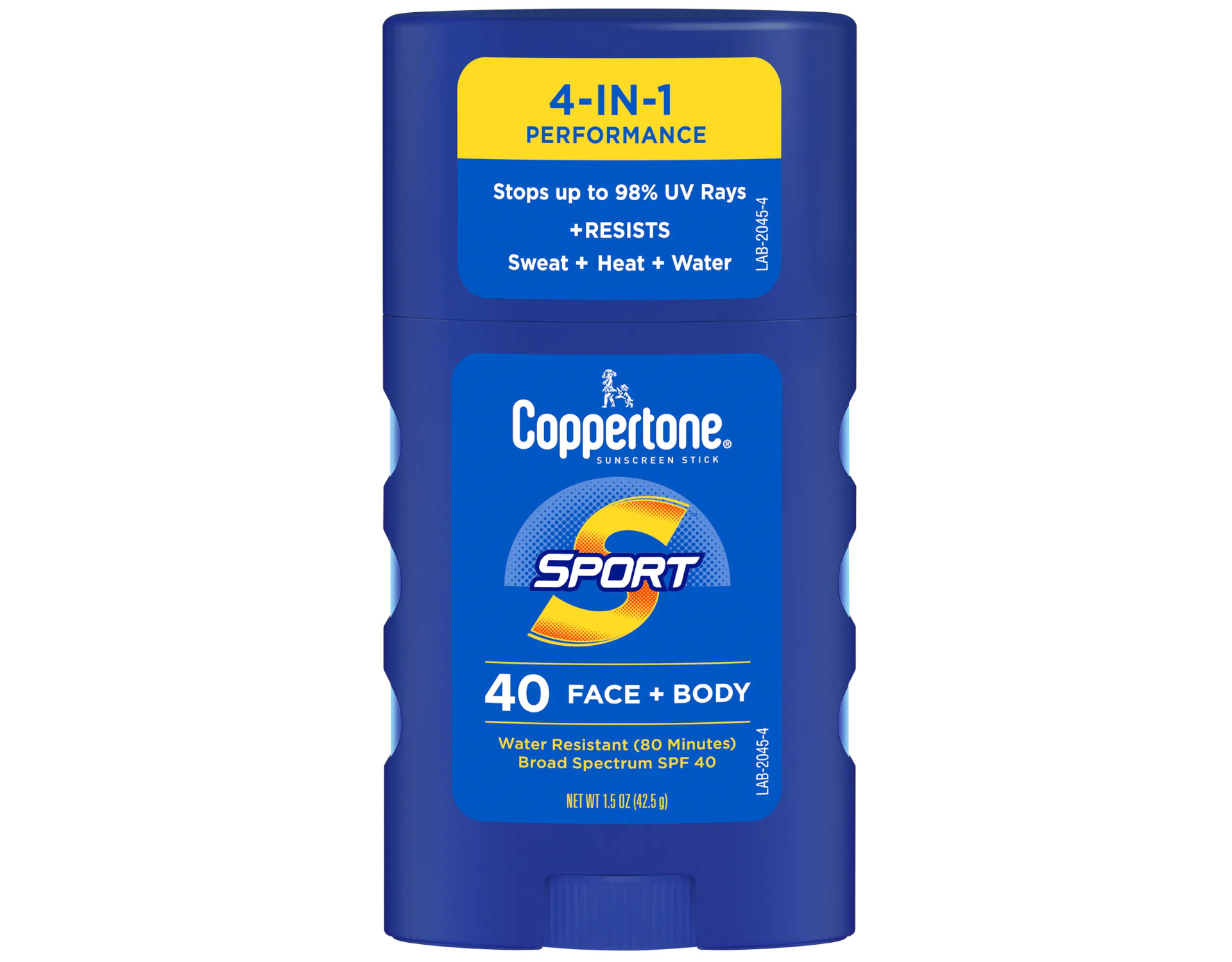 Whichever outdoor activity you’re passionate about, Coppertone Sport SPF 40 Sunscreen Stick is on your team. Designed to stay on strong when you sweat, this high-performance stick sunscreen for face and body protects your skin from the sun with a durable and water resistant sunscreen formula (80 minutes). This Coppertone sunscreen offers broad spectrum UVA/UVB protection for exposed areas such as ears, nose and face. Each sunscreen Coppertone creates follows a tradition of trusted, quality sun protection products. Coppertone has been providing continuous innovation for more than 75 years, and is voted the most trusted sunscreen brand.* Depend on this tough sport sunscreen SPF 40 formula during any outdoor activities, whether you’re getting out for a work day, heading to the big game or enjoying an afternoon of fun in the sun. This pack includes one 1.5 ounce sunscreen travel size stick. Use and reapply Coppertone Sport sunscreen as directed. *Voted Most Trusted Sunscreen Brand by American Shoppers Based on the 2020 BrandSpark American Trust Study.