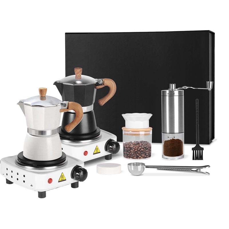 1*Moka Pot 1*Electric Stove 1*Coffee Grinder 1*Scoop 1*Glass Bean Jar 1*Paper Filter 1*Coffee Leveler