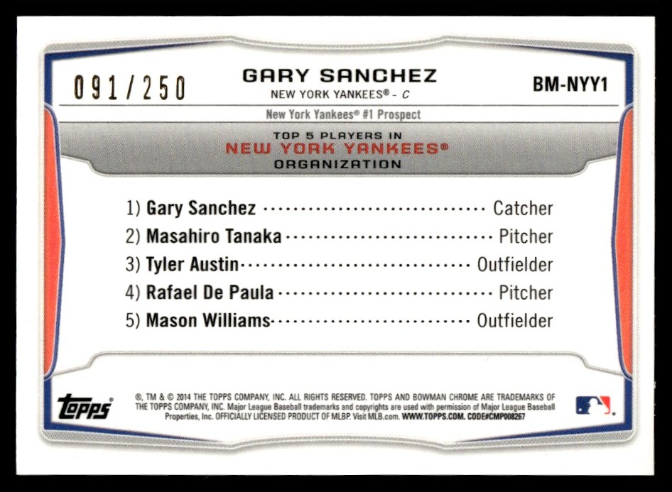 | 2014 BOWMAN MINI BLUE WAVE GARY SANCHEZ /250 #BMNYY1 |