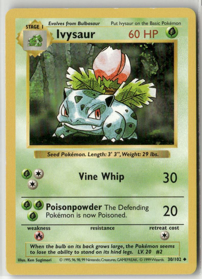 | Description: | Ivysaur | | Category: | Pokemon | | Year: | 1999 | | Product: | Pokemon Classic - Base Set | | Set: | Vintage SHADOWLESS WotC | | Card Number: | 30/102 | | Dimensions: | 3½" x 2½" | | SKU: | PM B0001 R01 X (4) |
