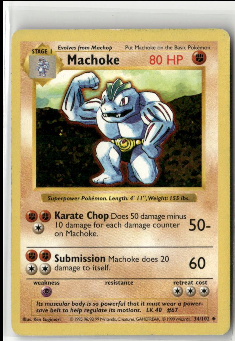 | Description: | Machoke | | Category: | Pokemon | | Year: | 1999 | | Product: | Pokemon Classic - Base Set | | Set: | Vintage SHADOWLESS WotC | | Card Number: | 34/102 | | Dimensions: | 3½" x 2½" | | SKU: | PM B0001 R01 X (27) |
