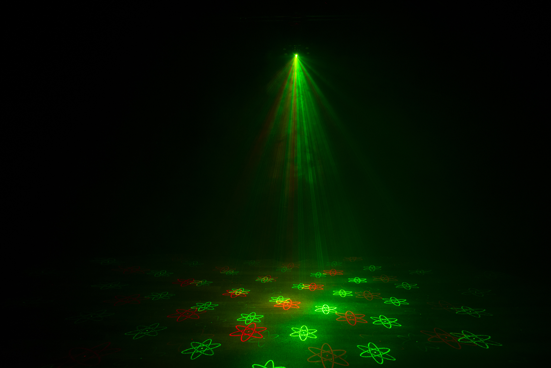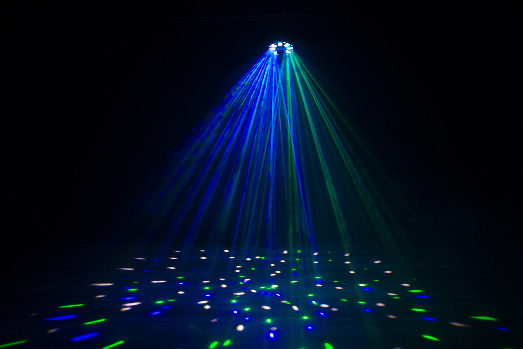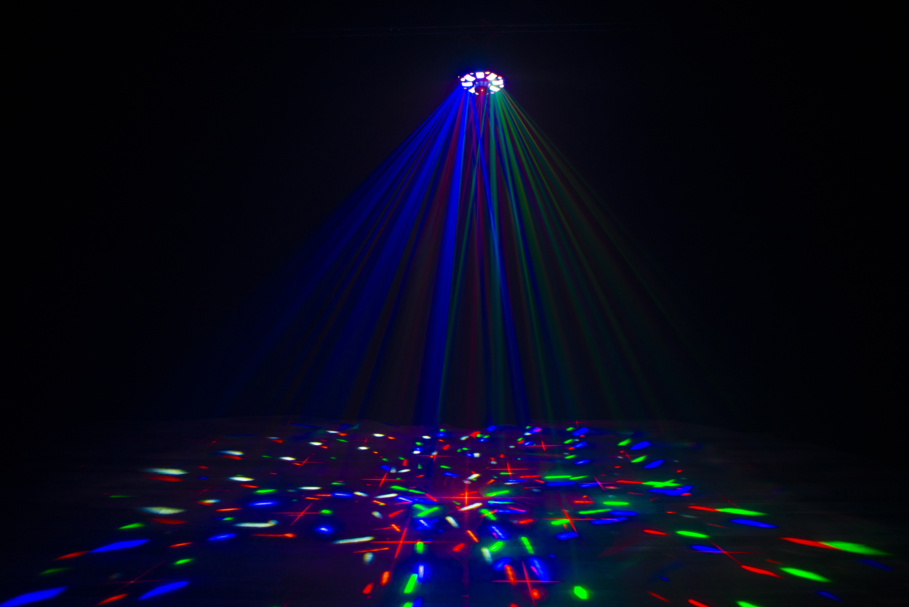 The Moonflower effects, powered by the penta-LEDs, fill a room with quick-moving multi-colored light. Plus, washes of color fill a dance floor from the quad-LED illuminating the crowd. And finally, razor-sharp red and green laser diode can fill the room with safe laser beams. All this together from the fixtures built-in shows, or from custom DMX programming, create a professional club-style atmosphere, with or without the use of fog.