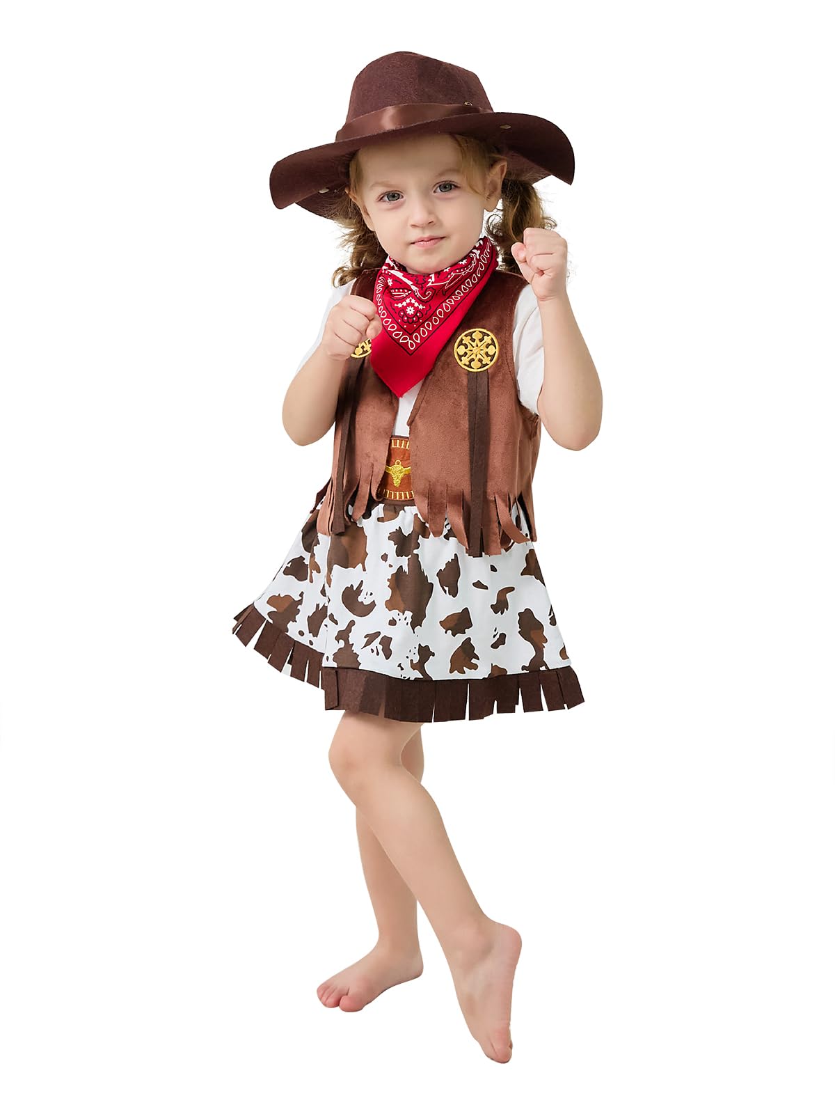 Design - The vest's design is both eye-catching and functional, perfect for layering over a crisp white shirt or t-shirt. Complementing the vest is a denim skirt. a cowboy hat is included to provide shade and sun protection, Rounding out the outfit is a red scarf that add a pop of color and personality to the ensemble. This scarf can be tied in various ways, allowing child to express their individuality.
