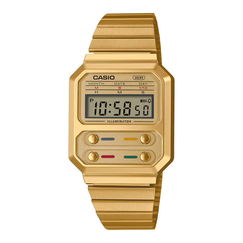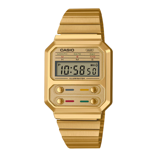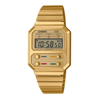 The A100 series is a reproduction of the F-100, CASIO's first resin case model. The design has been updated for this more modern version while retaining the distinctive layout of the F-100's four front buttons along with CASIO vintage metal elements.