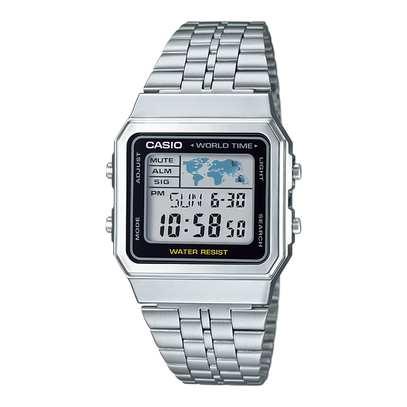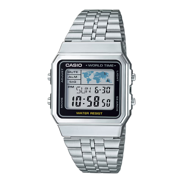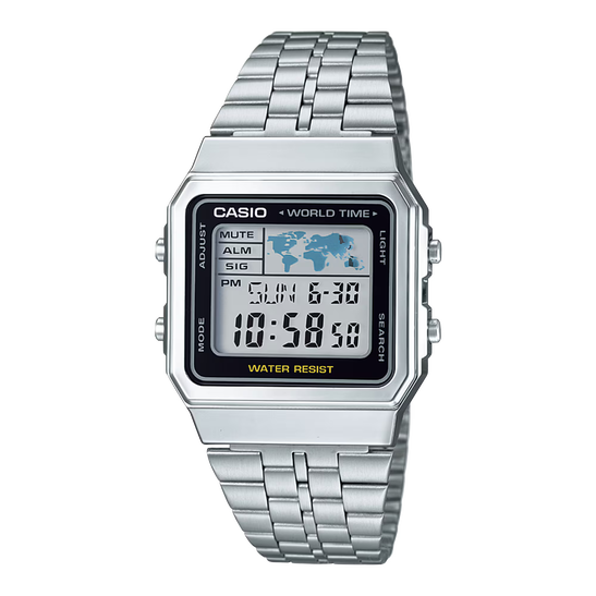 The A100 series is a reproduction of the F-100, CASIO's first resin case model. The design has been updated for this more modern version while retaining the distinctive layout of the F-100's four front buttons along with CASIO vintage metal elements.
