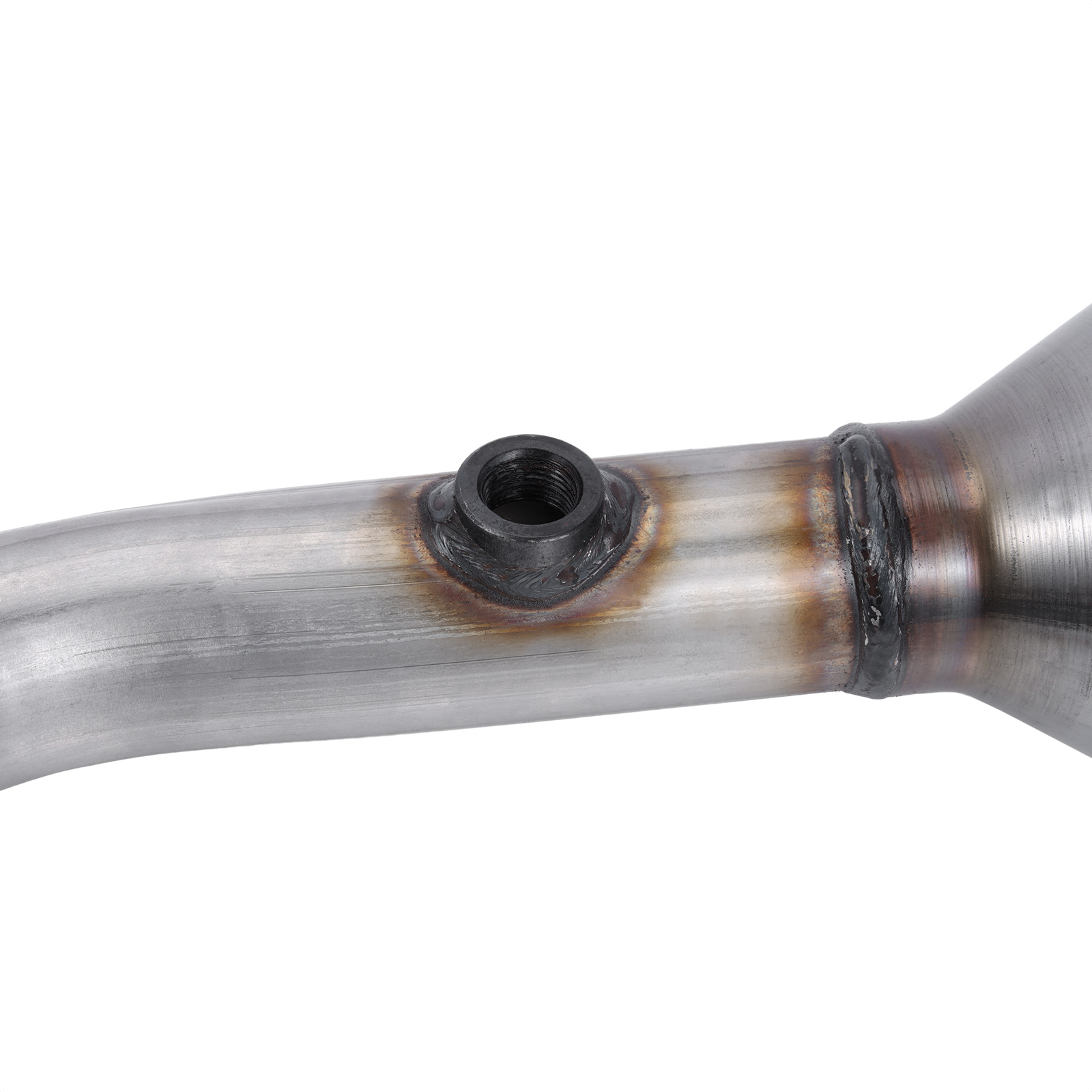 The pipe constructed from 14 gauge tubing, with original oe style heavy duty stainless flanges, inner braid flex pipe and high loaded OBDII by design catalytic converter