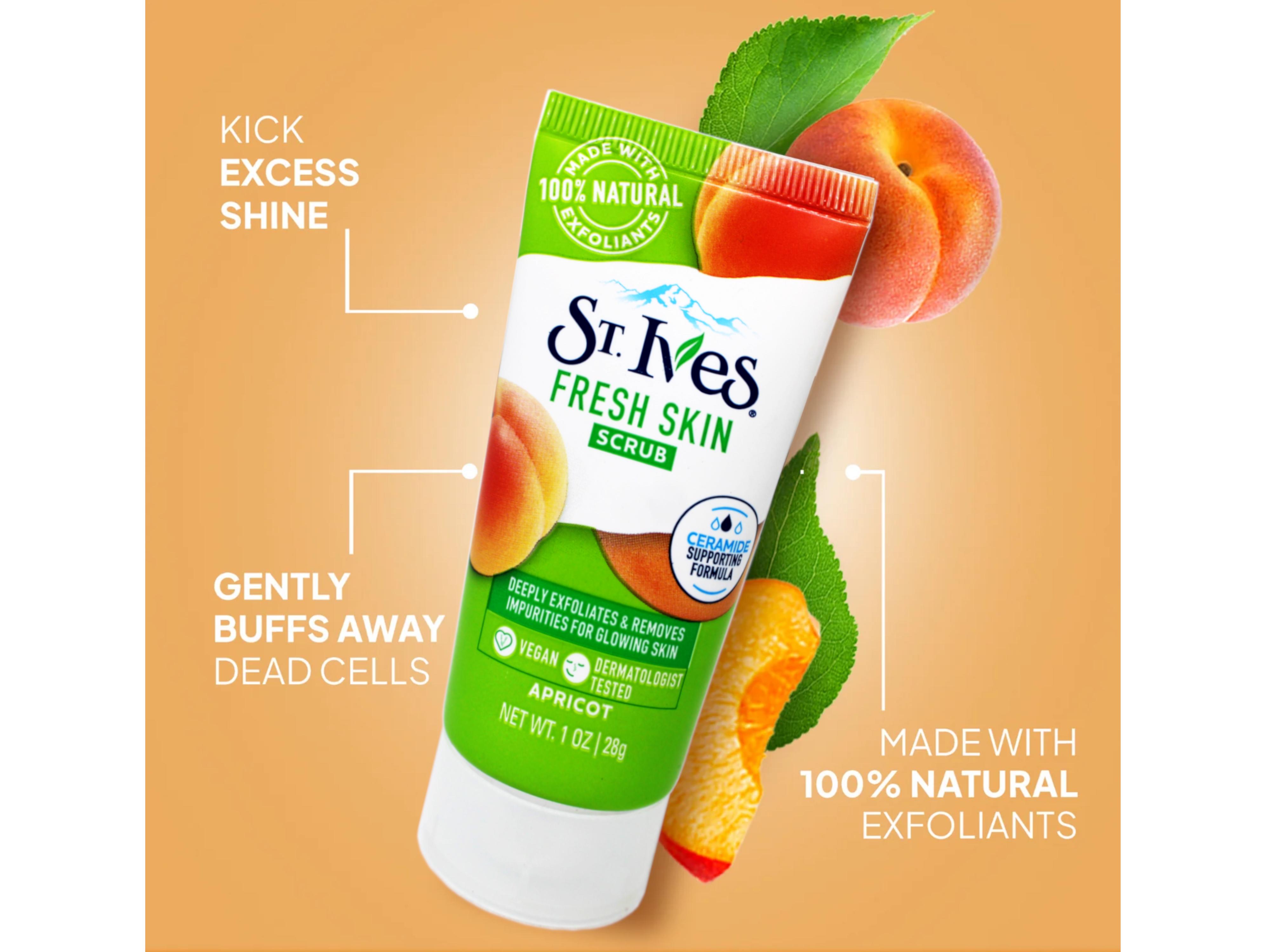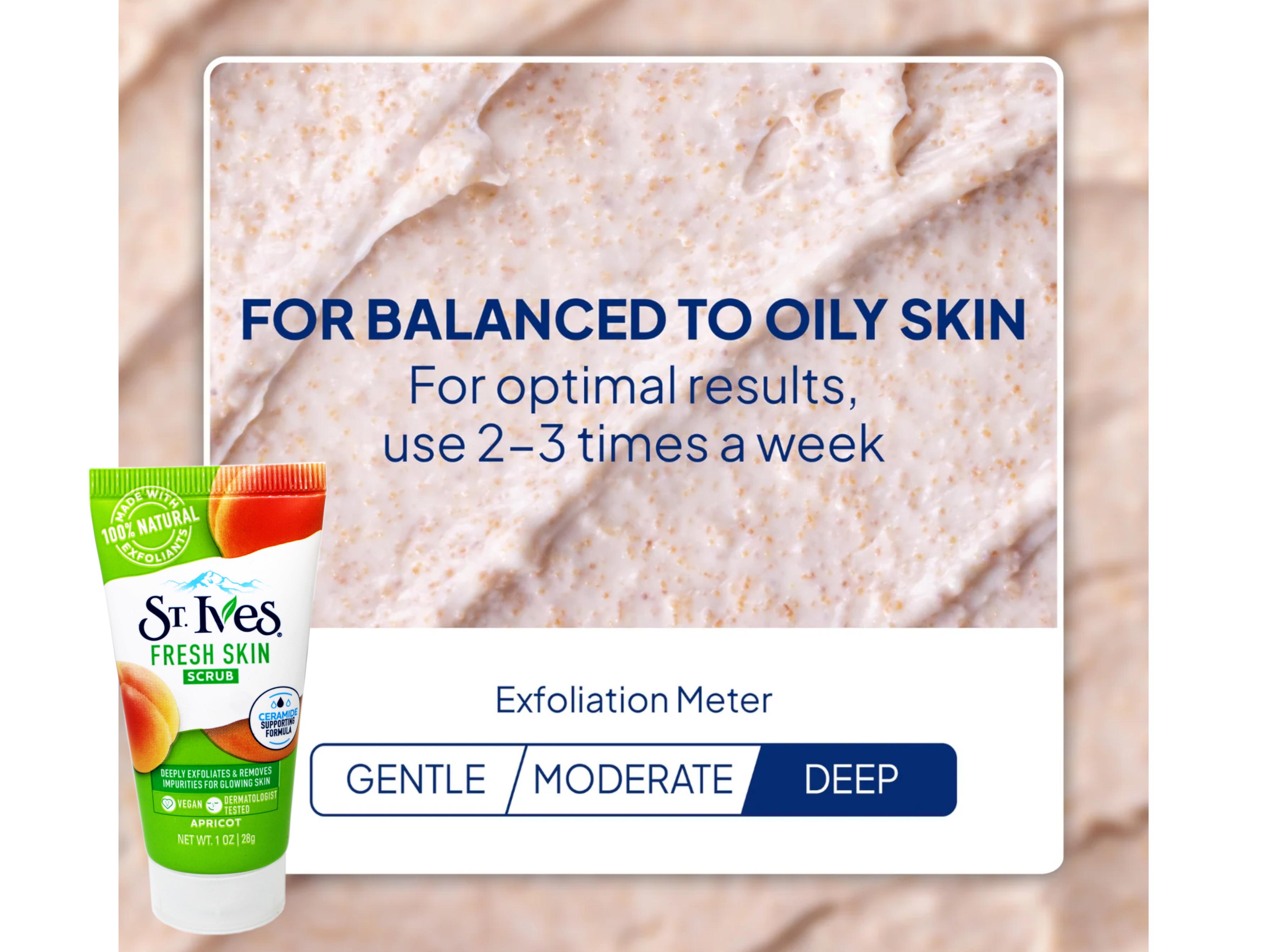 St. Ives Fresh Skin Apricot Scrub delivers a deep exfoliating cleanse that leaves your skin smooth, refreshed, and glowing. Made with natural exfoliants, this travel-size scrub helps remove dirt, oil, and dead skin cells for a radiant complexion. Perfect for on-the-go use, it provides gentle yet effective exfoliation, revealing soft and healthy-looking skin after every wash. Bullet Points: Deeply exfoliates to remove dirt, oil, and dead skin cells Infused with natural exfoliants for fresh, radiant-looking skin Apricot formula leaves skin feeling soft and revitalized Travel-friendly 1 oz size, perfect for purse, gym bag, or carry-on Dermatologist-tested and suitable for all skin types