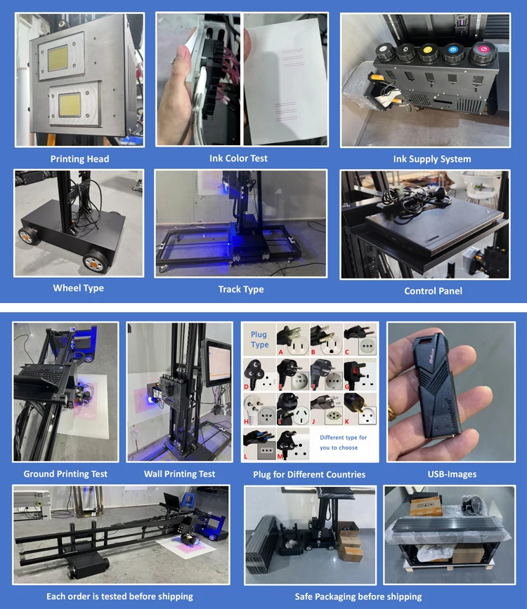 Nozzle Model:2pcs Epson DX10 Machine Features :Wall and Floor printers Printing Materials:Putty walls, latex paint, cement walls, metal, tiles, glass, wood boards and most other flat surfaces. Printing accuracy: 360*720*1440*2880dpi Print size:3m*6m Print speed:Draft mode 10-12 square meters/hour Standard mode 6-8 square meters/hour HD mode 5 square meters/hour Power supply:110v Language:English Image Format:PSD、CDR、JPEG、JPG、PNG、BMP、TIFF、EPS、AI、PDF etc. Operating system:Windows XP/7/8/9/10 The package weight is about 120kg, and the package size is 115*71*75cm
