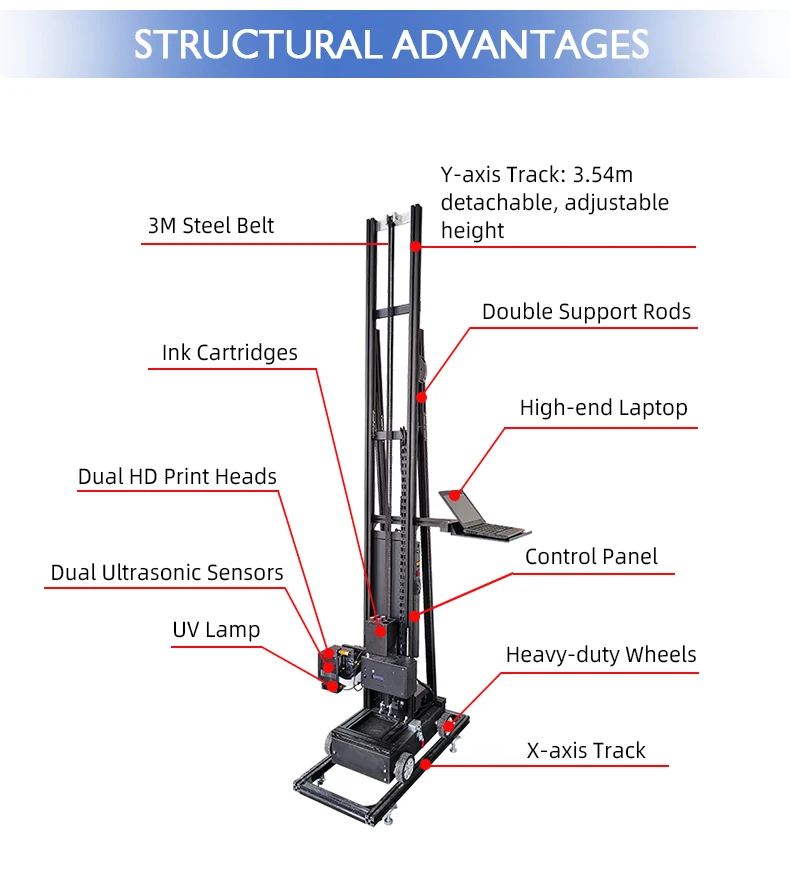 8.The printing area is large and not limited by the printing size. The printing height consists of5 poles of different sizes, which are 0.4 meters, 1.1 meters, 1 meter, 0.5 meters, and 0.5 metersrespectively. These poles can be spliced randomly to meet the needs of different workingspaces. lf there are special requirements, you can also ask us to customize poles of differentspecifications. The printing length is unlimited and can be extended infinitely.