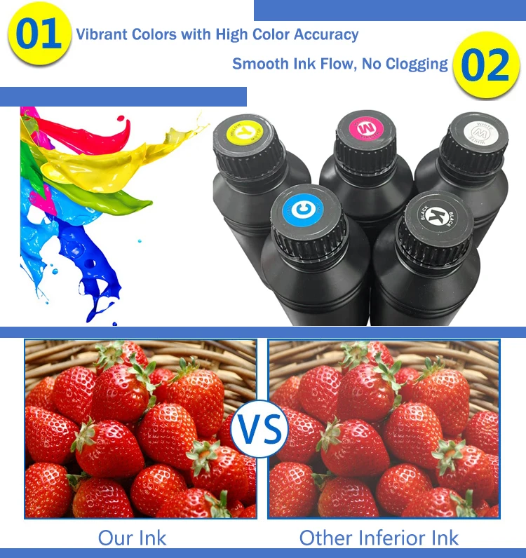 5.Professional uv inkisused, with five colors of CMYK + W (cyan, magenta, yellow, black and white). lt can print onwhite, dark or colored surfaces. lt dries immediately after printing, and is waterproof.moisture-proof, scratch-resistant, and will not fade for 10 - 20 years.