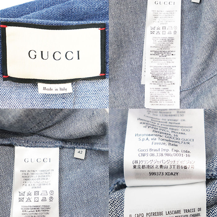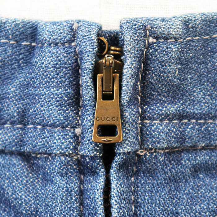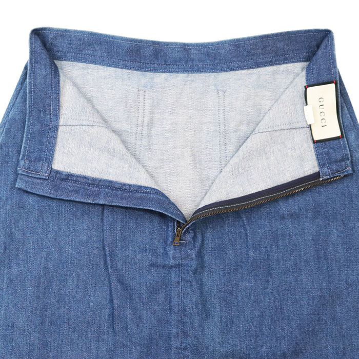 | Series | GUCCI denim skirt with GG logo, interlocking horsebit web stripe, A-line silhouette, size 42, indigo, made in Italy. |