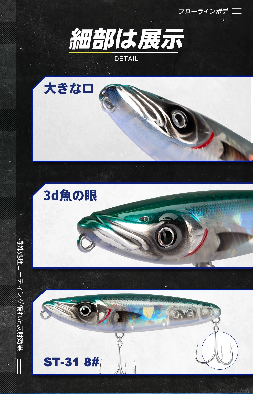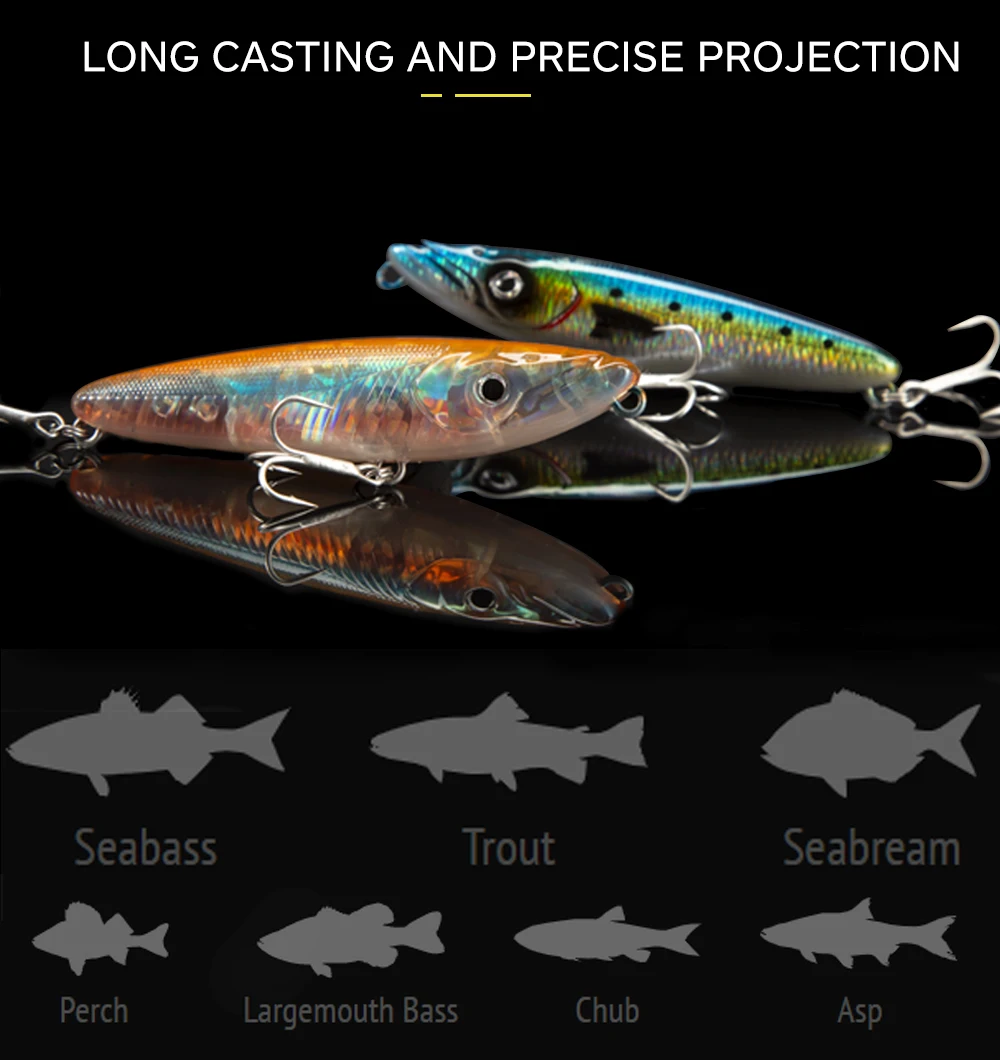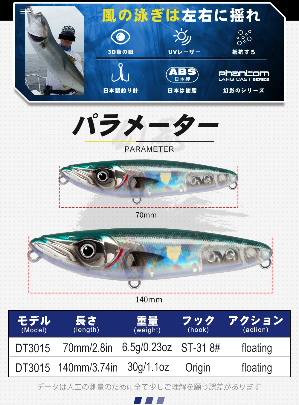 1、DT3015 is a lure that allows reaching long distances and precise casts still with and extremely easy execution of the walking or sliding techniques.