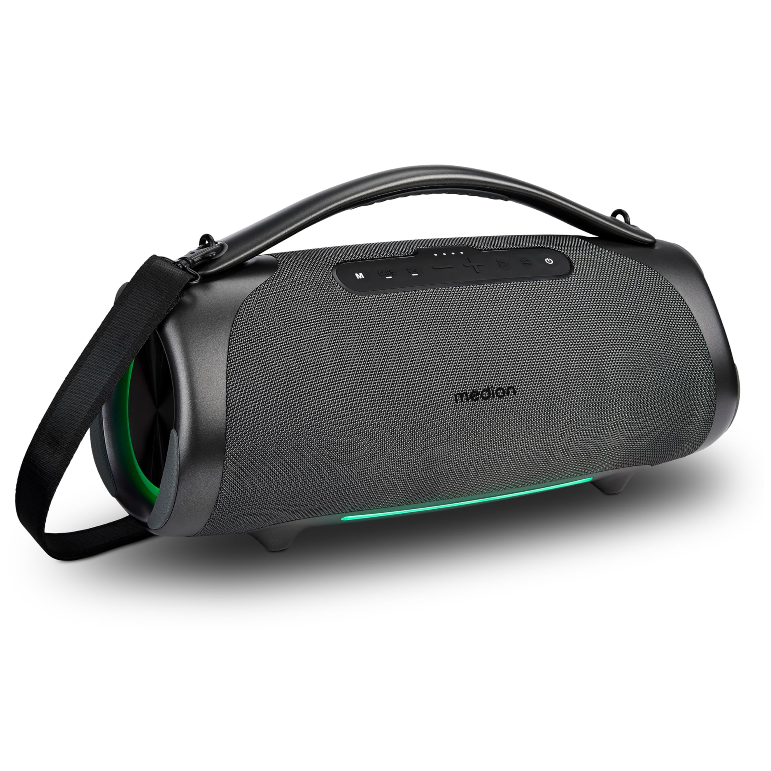Medion LIFE® P61768 Tragbarer Bluetooth® Lautsprecher XL in SchwarzDer Medion LIFE® P61768 ist der ideale Begleiter für alle, die kraftvollen Sound unterwegs und zu Hause genießen möchten. Dieses hochwertige, vielseitige Lautsprechersystem vereint beeindruckende Klangqualität mit praktischen Funktionen, die Ihre Musikhörerfahrung auf ein neues Level heben. Ob bei Partys im Garten, auf Reisen oder im Wohnzimmer – der robuste Bluetooth-Lautsprecher bietet Ihnen flexible Nutzungsmöglichkeiten und eine brillante Soundwiedergabe. Leistungsstarker Klang und beeindruckendes DesignMit 100 W RMS Ausgangsleistung sorgt der XL-Lautsprecher für einen kraftvollen, dynamischen Sound. Zwei passive Bassradiatoren, zwei Hochtöner und zwei Tieftöner ermöglichen eine ausgewogene Klangqualität mit tiefen Bässen und klaren Höhen. Dank der Bass-Boost-Funktion auf Knopfdruck können Sie den Bass noch intensiver erleben. Die integrierte Beleuchtete Bassradiatoren und die wechselbaren RGB-Lichteffekte setzen optische Highlights und sorgen für eine stimmungsvolle Atmosphäre. Vielseitige Ausstattung für höchsten Komfort