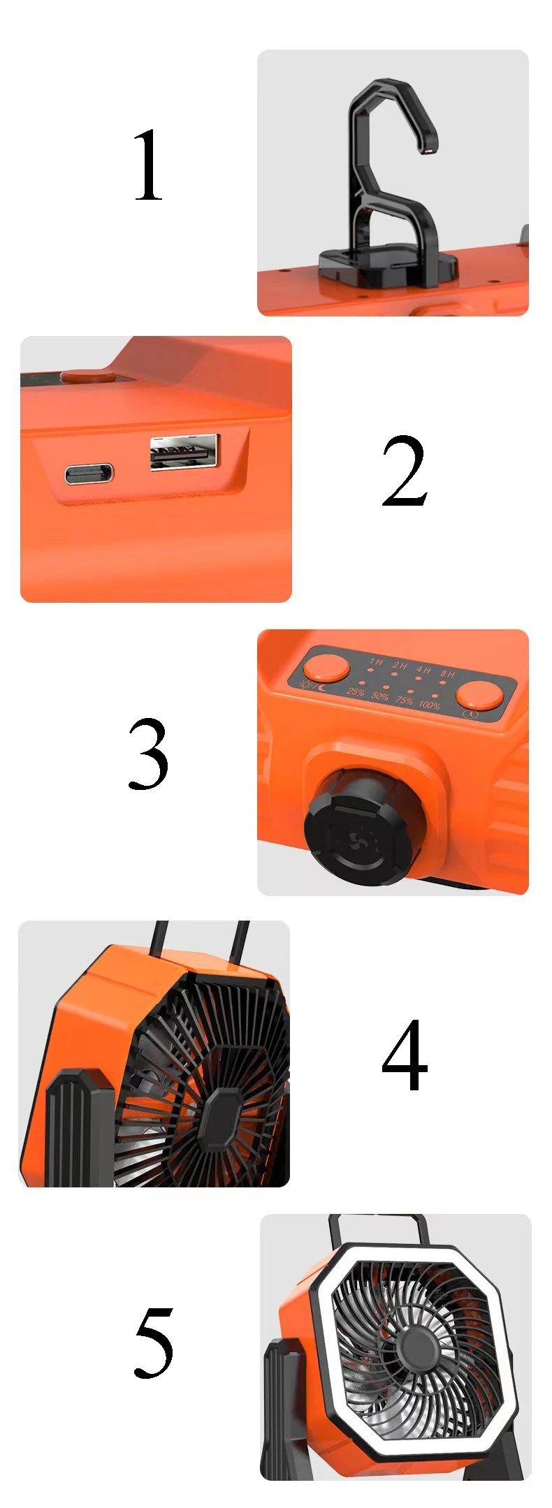 1. The Type-C interface supports the same input and output port, which can be used to charge the fan.