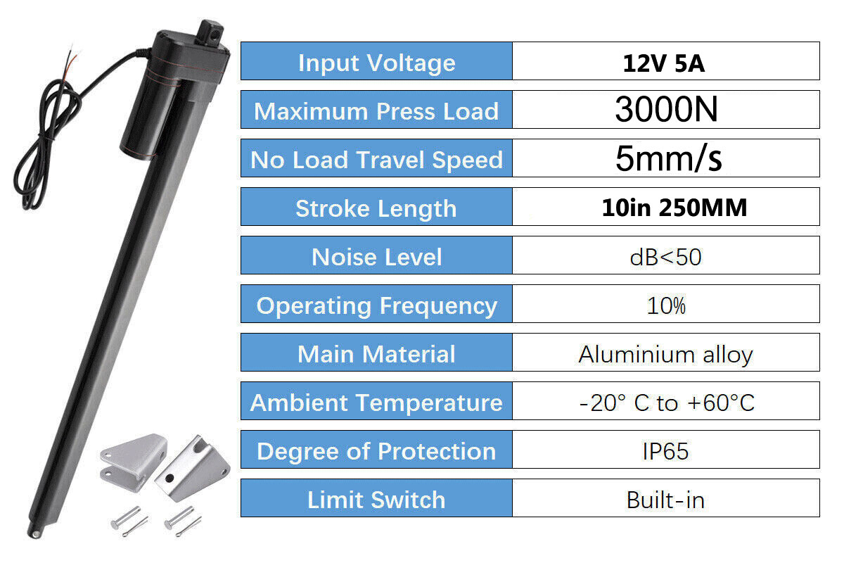 10Inch 250MM High Speed5mm/s Linear Actuator Motor 3000N DC12V Mounting Brackets