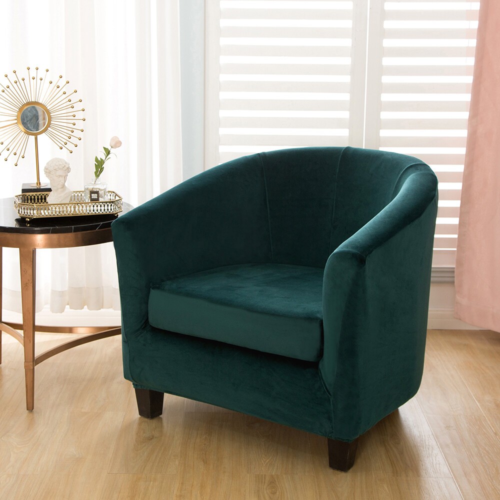 GREAT FIT: This innovative 2 piece tub chair cover is crafted from luxurious velvet plush fabric, including 1 piece of base cover and 1 piece of the cushion cover; club chair slipcover (fit the tub chair width: 25.6 to 29.5in; chair height: 25.6 to 28.3 in; Cushion length: 19.7 to 21.6 in; Cushion width: 17.7 to 20.5 in); feature one-size-fits-most, kindly measure before ordering