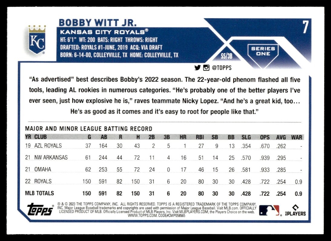 | 2023 TOPPS BOBBY WITT JR. KANSAS CITY ROYALS #7 |