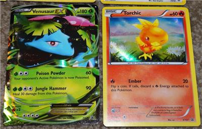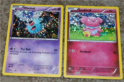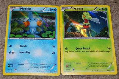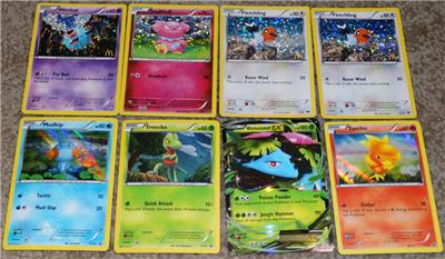 This sale is for a lot of 8 Pokemon holographic promotional cards. The XY black star promos are from 2014 and they are Venusaur EX (xy28), Treecko (xy36), Torchic (xy37) and Mudkip (xy38). The 2 McDonalds promos are Woobat (7/12), Snubbull (8/12) and 2 Fletchlings (11/12). After I created the listing I came across another promo that is not pictured and I am throwing in with the lot. It's a Mew black star promo from 2000 and is #8. The cards are in excellent condition. The fronts and clean and sharp. The exception is Treecko who has a bent corner. The backs have light to moderate wear along the edges.
