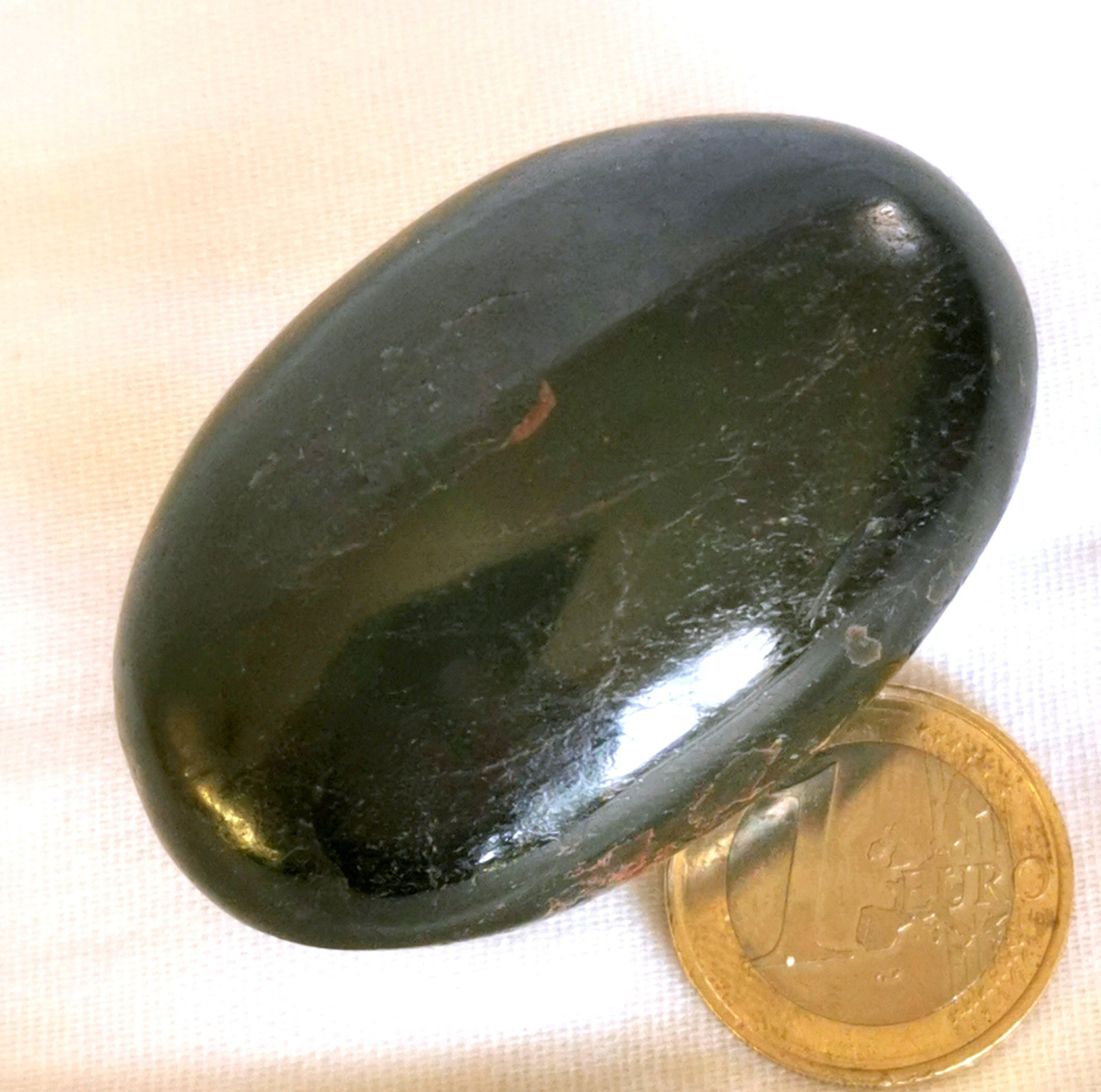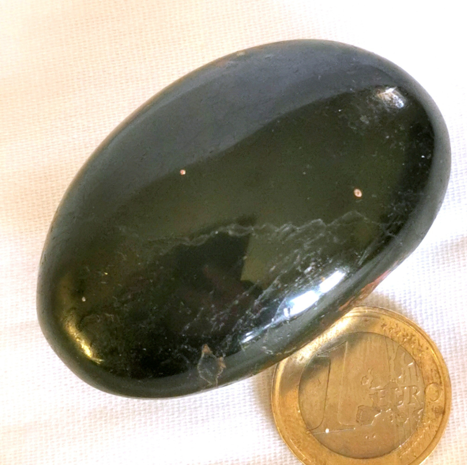 wunderbarer Handschmeichler aus schwarzem Turmalin (Schörl) aus Madagaskar, Abmessungen ca. 56 * 36 * 28 mm, Gewicht ca. 99 Gramm. Kleine Drusen und Vertiefungen auf der Oberfäche des Steins sind natürlichen Ursprungs und machen ihn zu einem besonderen Stück.