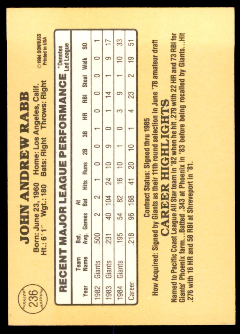 | 1985 Donruss John Rabb Baseball Cards #236 |